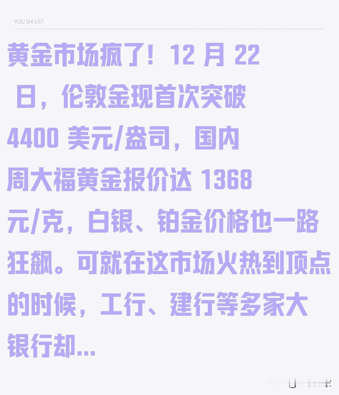 黄金市场疯了!12 月 22 日,伦敦金现首次突破 4400 美元/盎司,国内周大福黄金报价达 1368 元/克,白银、铂金价格也一路狂飙。可就在这市场火热到顶点的时候,工行、建行等多家大银行却突然对“炒金”按下暂停键,清理闲置账户、提高保证金比例。银行这是为啥呢?苏商银行研究员说为防客户大亏,说白了就是不想背风险。 二级市场这边,A股 贵金属板块倒是涨势喜人。不过专家提醒,黄金短期价高,年底或横盘。个人投资者还能选黄金 ETF、积存金产品或者投资金条。银行这波操作后,黄金市场会怎么走?散户该如何应对?后续投资机会又在哪? 黄金行情价格 金价行情 黄金价值分析 金价回收行情 黄金售卖价格 黄金白银价格 金价行情 黄金价值分析 黄金售卖价格 黄金白银价格 黄金价 金金价 黄金一克720