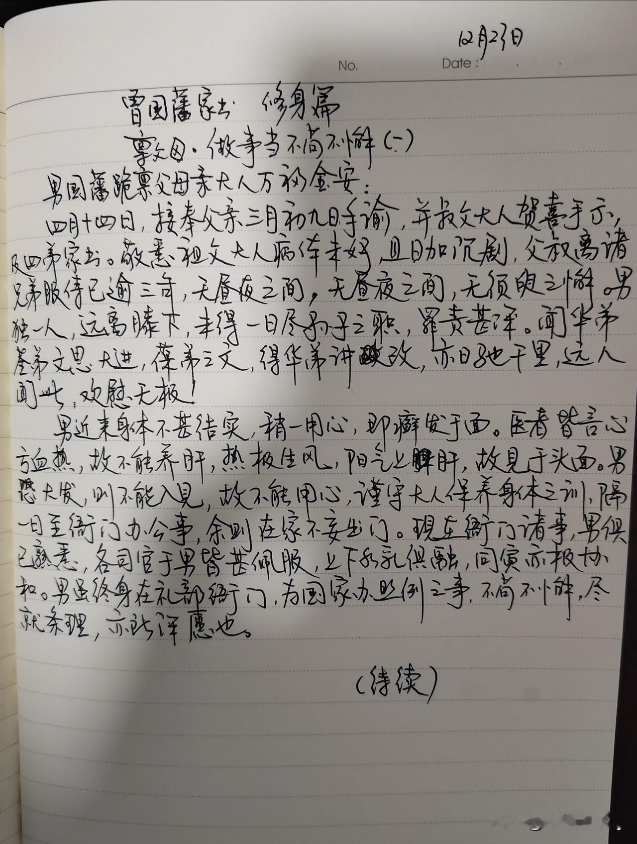 家庭共读并抄书第十天:《曾国藩家书》修身篇 禀父母.做事当不苟不懈(一) 曾国藩为朝廷做事不苟不懈,尽就条理。其实就是认认真真做事,我们现在的工作何尝不是这样,既然领导交给了我们任务,我们就应该尽力做到最好!