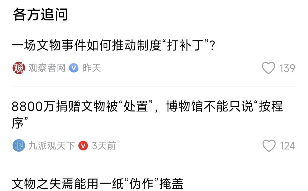南京博物院这件事情,如果是真的话,那真的就诠释了什么叫“监守自盗”,感觉是很多电影画面的现实版本。如果这件事情是真的,那么捐赠文物的人应当有权利收回全部所捐赠的文物。如果这件事情是真的,今后还有谁敢捐赠文物给我们的博物院。所以这件事情绝对不是一件小事情,首先要查一查各大博物院的仓库,另外,要特别注意某些人用特殊方式销毁证据。这种事情不是一个人能干成的,如果是真实的话,那肯定是一条藤上的一串瓜。想一想其实挺可怕的,一件我一件,文物可能就散去了。另外,我觉得捐赠文物的人,有权利随时去博物馆核实文物是否还在,或者是否被替换,是否从博物院留到了拍卖市场。希望这是个例,而不是冰山一角,这件事情一定要查个水落石出,还民众公信力,否则我相信以后还想是要百姓捐赠文物,恐怕就比较难了。这样的事情是有相类似的教训的。