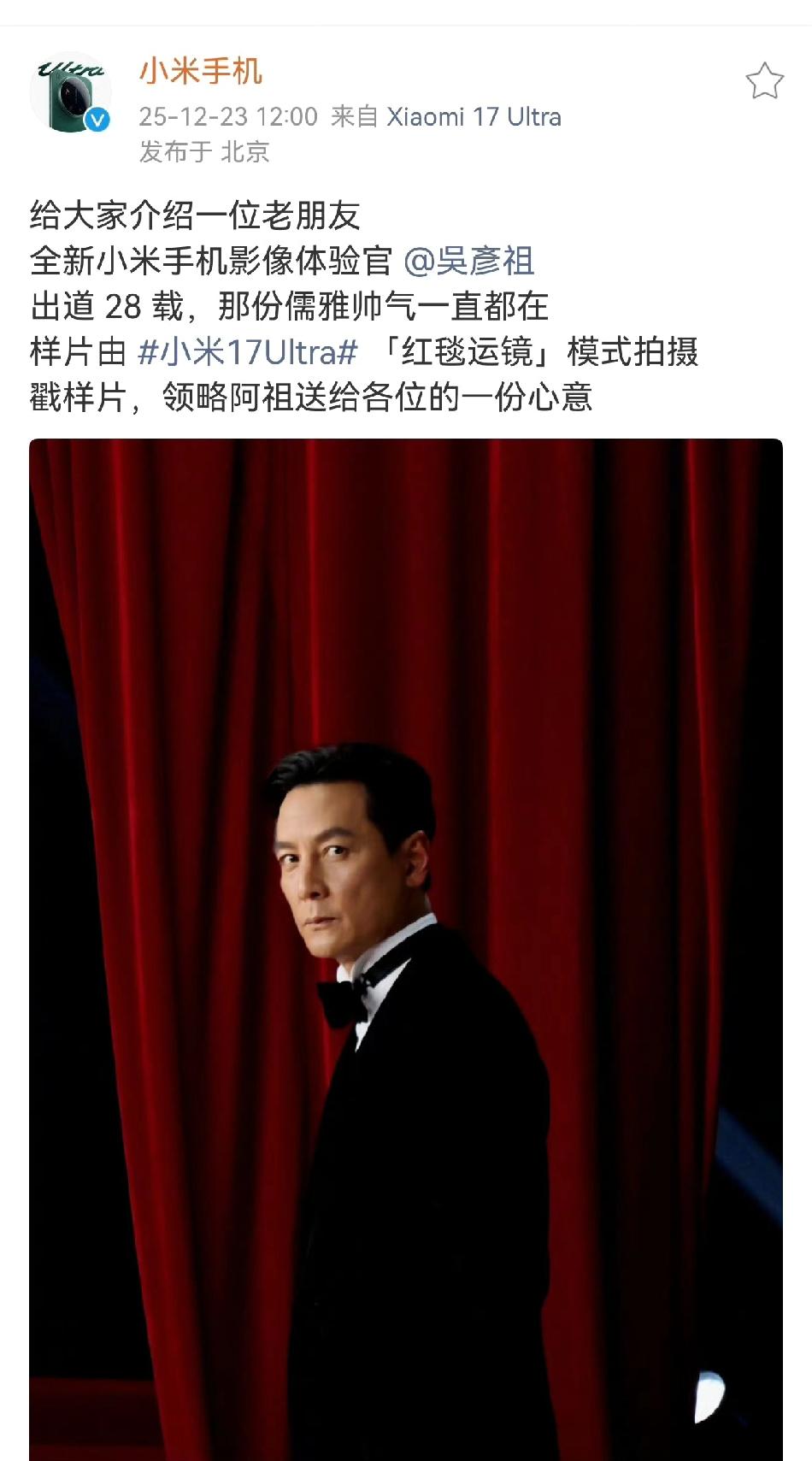 你用小米17 Ultra,那么你也是吴彦祖[星星眼][星星眼][星星眼]。我发现现在各大厂都喜欢选择这些资深帅哥做旗舰机代言人了。 华为非凡大师选择刘德华,荣耀magic选择谢霆锋,小米Ultra又选择了吴彦祖。 是因为原来那些小鲜肉代言人号召力不够?还是因为这些旗舰机的客户群体并不喜欢那些小鲜肉呢?