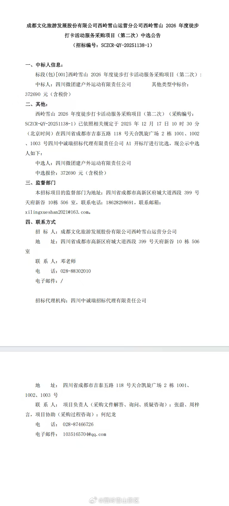 成都文化旅游发展股份有限公司西岭雪山运营分公司西岭雪山2026年度徒步打卡活动服务采购项目(第二次)中选公告