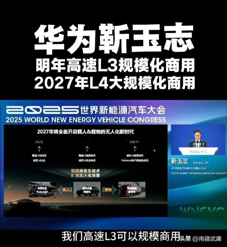 华为乾崑智驾放大招!2027年无人化出行要成真 2025世界新能源汽车大会上,华为靳玉志公布的智驾规划,直接让行业看到了高阶自动驾驶落地的清晰路径,乾崑智驾的技术实力更是藏不住了! 先看硬成绩:辅助驾驶总里程突破50亿公里,累计泊车2.8亿次,还硬生生避免了271万次碰撞,这数据足以证明乾崑智驾的可靠性。而且目前已有超100万辆车搭载这套系统,和鸿蒙智行、广汽、奥迪等品牌的合作车型也达28款,技术落地速度远超同行。 更关键的是落地节奏:2026年高速L3规模化商用,2027年城区L4也能商用,意味着明年跑高速就能放心用高阶智驾,后年在城市里也能体验无人化出行。今年推出的ADS 4系统还升级了全维防碰撞功能,停车场车位到车位通行覆盖超50万个场地,日常用车的智能体验直接拉满。 华为这波智驾技术的推进,可不是纸上谈兵,而是真真切切要让无人化出行走进普通人的生活里。
