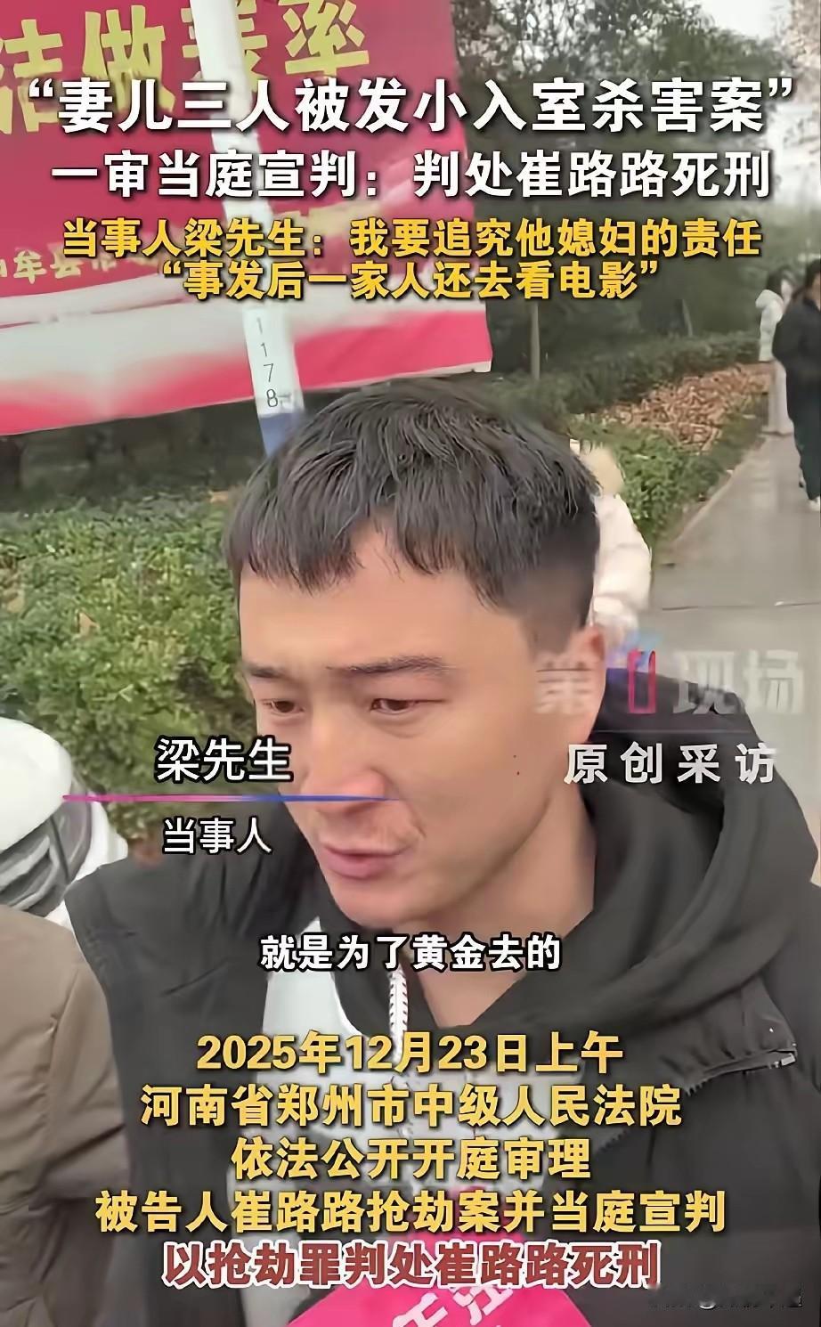 庭审刚落槌,崔某伏法的消息还没传开,梁先生红着眼眶吼出的一句话,直接戳得人头皮发麻:“我要追究他媳妇!” 凌晨摸黑用偷配的钥匙撬门,冲着黄金来的,翻东西惊醒了发小的妻女,当场就下死手,刀砍、绳勒,三条人命说没就没。 更让人浑身发冷的是,崔某满身是伤、裤裆带血跑回家,他媳妇瞧见这副鬼样子,居然一声不吭,跟着一家人乐呵呵去看电影。 这哪是不知情,分明就是揣着明白装糊涂的帮凶!崔某早把发小当成了可以随便啃的提款机,他媳妇更是把冷血刻进了骨子里,三条人命的惨案,在他们家竟成了不值一提的! 老话真没说错,交友先看人品,遇人不淑,害的可能就是全家性命! 说真的死刑真的太便宜他了! 各位读者你们怎么看?欢迎在评论区讨论。