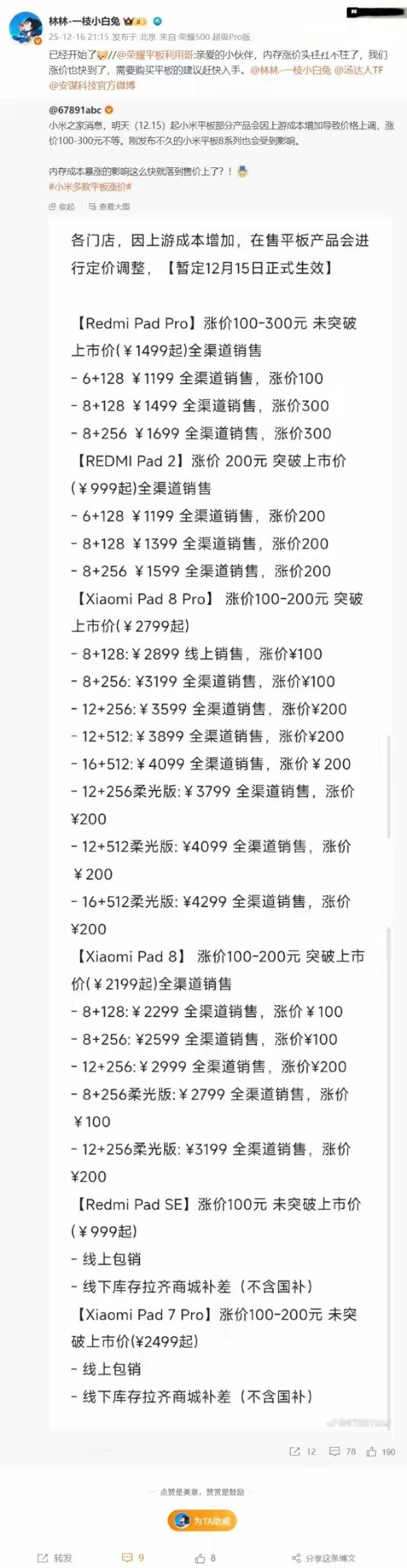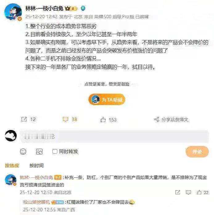 【荣耀林林:整个行业成本趋势非常恶劣,二手机不排除会涨价】荣耀中国区智慧生活业务部部长林林发文分享了行业内的成本上涨趋势。他总结如下:1.整个行业的成本趋势非常恶劣2.目前看会持续很久,至少以年记甚至一年半两年3.如果确实有刚需,可以考虑早下手,从趋势来看,不是将来的产品会不会降价的问题了,而是之前已经发布的产品会突破发布价格涨价的问题了4.各种二手机不排除会涨价情况...林林表示,接下来的一年是各厂的业务策略定输赢的一年。他还透露,个别厂商的个别产品如果大量滞销,是不排除为了现金流亏损清货回笼资金。根据 TrendForce 集邦咨询 12 月 11 日发布的调查报告,由于预期 2026 年第一季存储器价格将显著上涨,智能手机、笔电产业上修产品价格、调降规格,销量展望再度下修已难避免,资源优势将向少数龙头品牌高度集中。荣耀终端股份有限公司平板与 IOT 产品领域总经理 利用哥 在 12 月 16 日表示:“亲爱的小伙伴,内存涨价实在扛不住了,我们涨价也快到了,需要购买平板的建议赶快入手。”林林则表示“已经开始了”。
