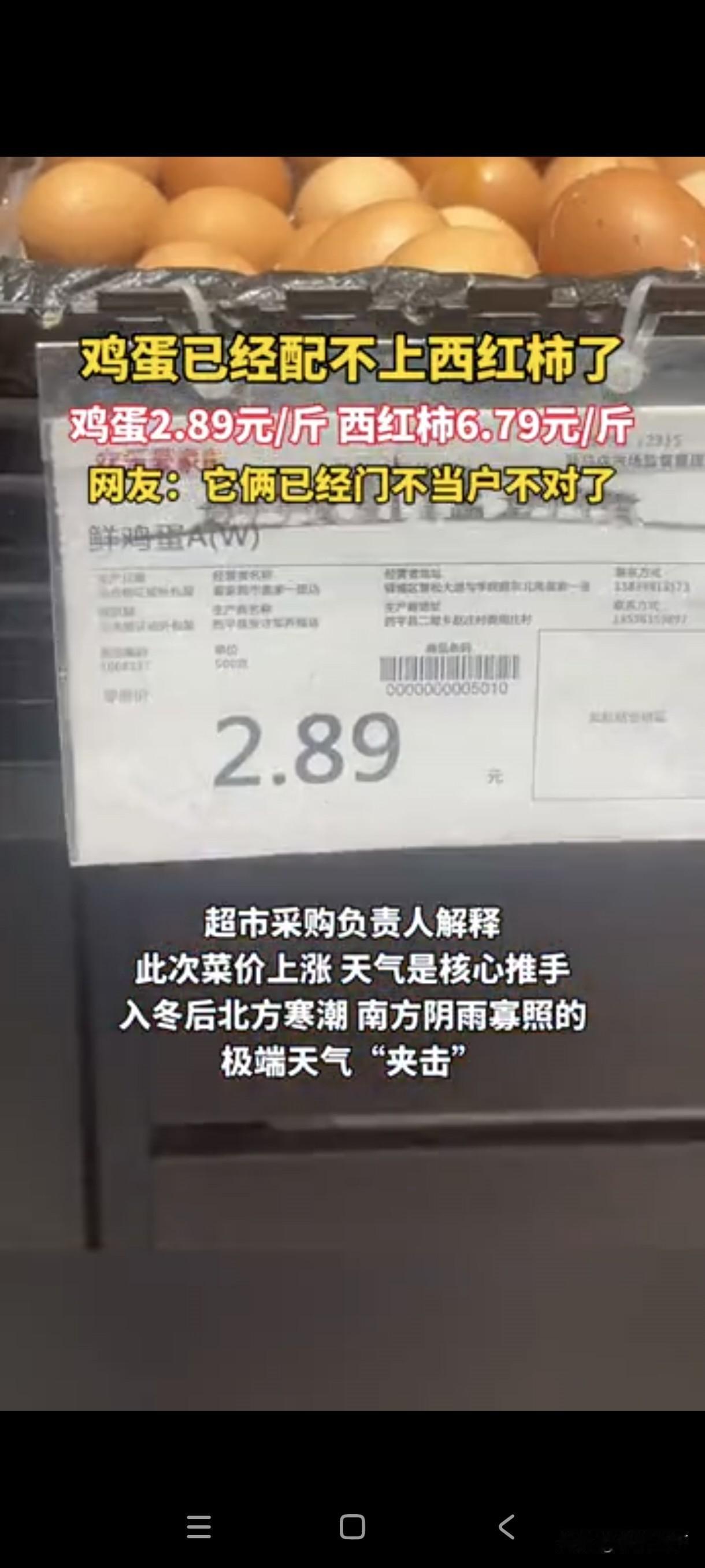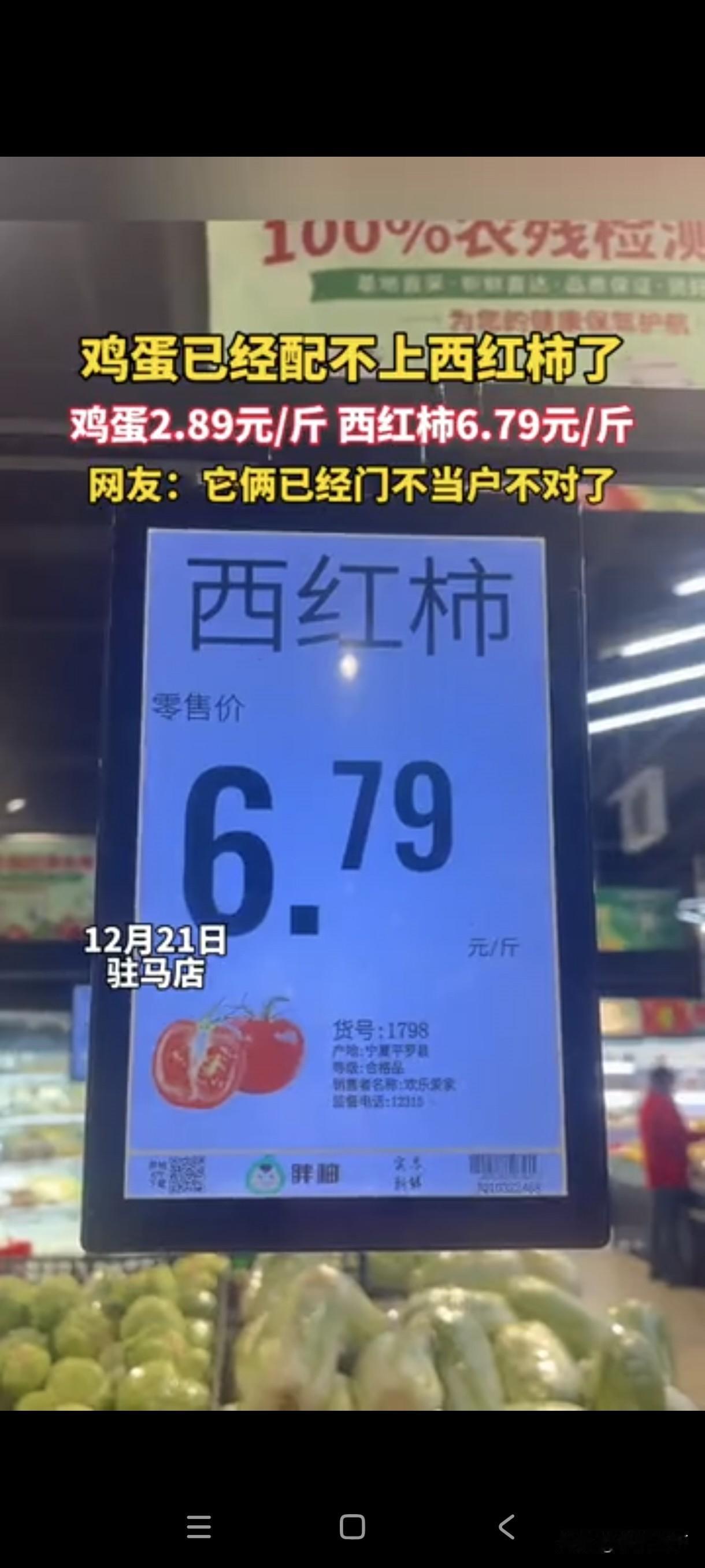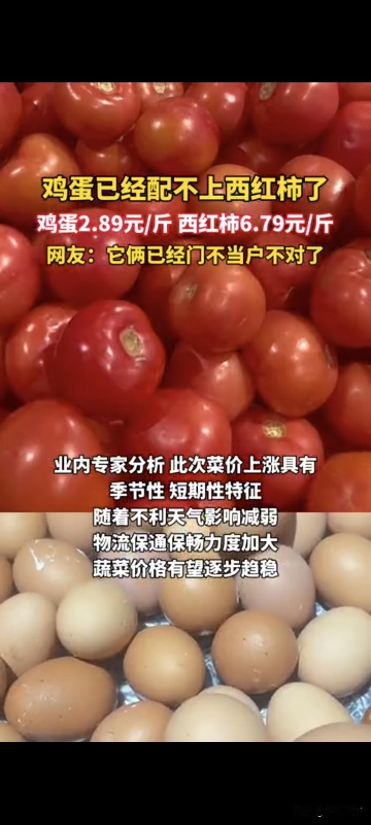 12月21日,河南驻马店,鸡蛋2.89元/斤,西红柿6.79元/斤,鸡蛋已经配不上西红柿了! 鸡蛋,是家庭餐桌上的常客,价格一度稳定在2.89元/斤,便宜又实惠。而西红柿,作为夏季的鲜亮主角,价格却飙升到6.79元/斤。一份西红柿炒蛋,曾经只需几块钱,现在可能要十几块。 朋友们,面对“鸡蛋配不上西红柿”的现实,你有什么想法?评论区等你来吐槽……