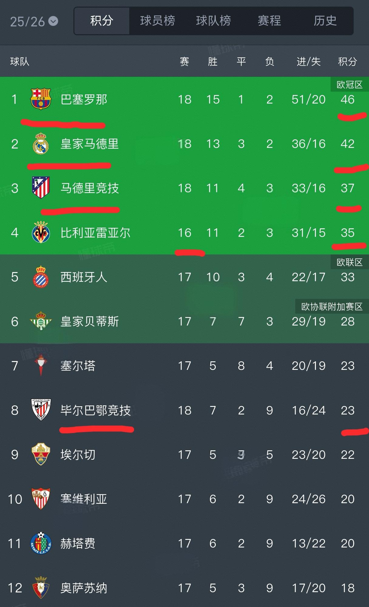 西甲第17轮全部结束,联赛进入两周的冬歇期,最新的西甲积分榜也出炉了!巴萨以四分优势领跑,皇马紧随其后,马竞暂居第三,但身后的比利亚雷亚尔只落后两分,还少赛两场! 本轮比赛巴萨2-0战胜比利亚雷亚尔,拉菲尼亚和亚马尔各入一球,自从国家德比输给皇马后,巴萨在西甲取得了八连胜!皇马2-0战胜塞维利亚,姆巴佩点射并追平C罗在皇马的自然年进球纪录,贝林厄姆头球破门,皇马取得三连胜。本赛季皇马高开低走,11月开始在西甲赛场接连遭遇多场平局,再加上主场输给塞尔塔,最终丢掉了榜首位置,还被巴萨反超4分。阿隆索一度面临着下课的危机,冬歇期对他来说是一个很好的调整时机,和巴萨的差距不算太大,皇马仍有机会追赶! 马竞本赛季引进了大量新人,但开局却很糟糕,还好他们近期稳住了局面,西甲排名也回到了前三,本轮凭借科克和格里兹曼两位老将的出色发挥3-0战胜赫罗纳!黄潜目前排名第四,只落后马竞2分,他们还少赛两场,本来是很有希望进入前三的!但他们近期的状态糟糕,遭遇了三连败,这其中还包括国王杯被西协乙球队淘汰出局!本赛季西甲最让人看不懂的球队是毕鄂巴鄂竞技,夏窗他们用高薪留住了球队进攻核心尼科-威廉斯,但球队战绩却很不稳定,威廉斯的状态也不如上赛季好,目前他们排在西甲积分榜的第八,距离欧冠区差了12个积分,这不是一个很容易能追赶上的差距,冬歇期后他们需要努力了!