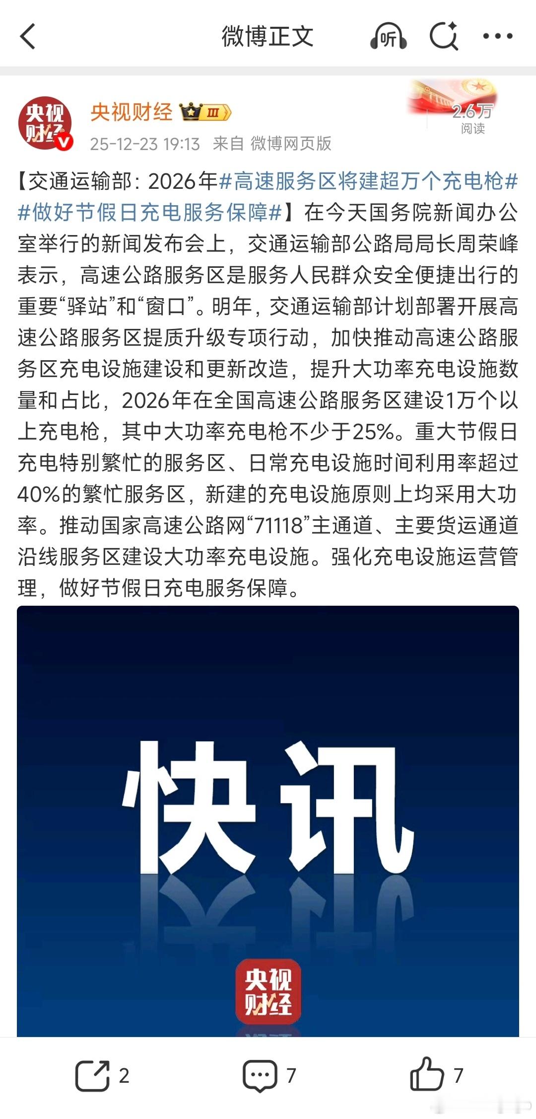 交通运输局出面了,2026年在全国高速公路服务区建设1万个以上充电枪。其中大功率充电枪不少于25%。重大节假日充电特别繁忙的服务区、日常充电设施时间利用率超过40%的繁忙服务区,新建的充电设施原则上均采用大功率。再搭配服务区充电车位的管理以及充电文明的素质教育,整体的充电体验应该会得到进步保障。今年过年大家一起看看!高速服务区将建超万个充电枪