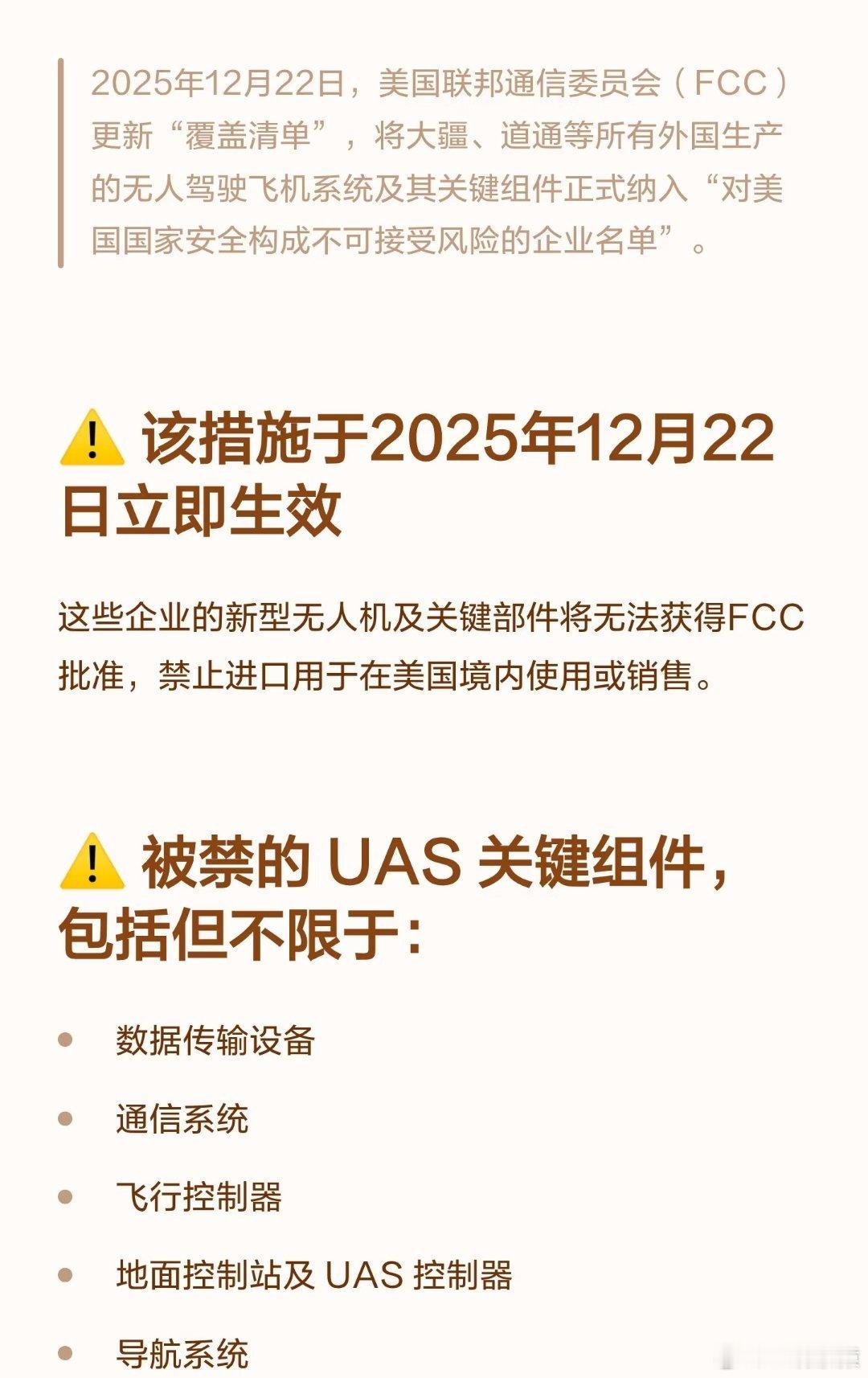大疆对美方决定表示遗憾美国禁止进口和销售大疆等外国无人机,看了下数据,大疆无人机占据全球消费级无人机市场份额70%以上,其中北美市场占比85%,在美国执法机构中的市占率90%、在美国紧急救援领域的市占率92%。