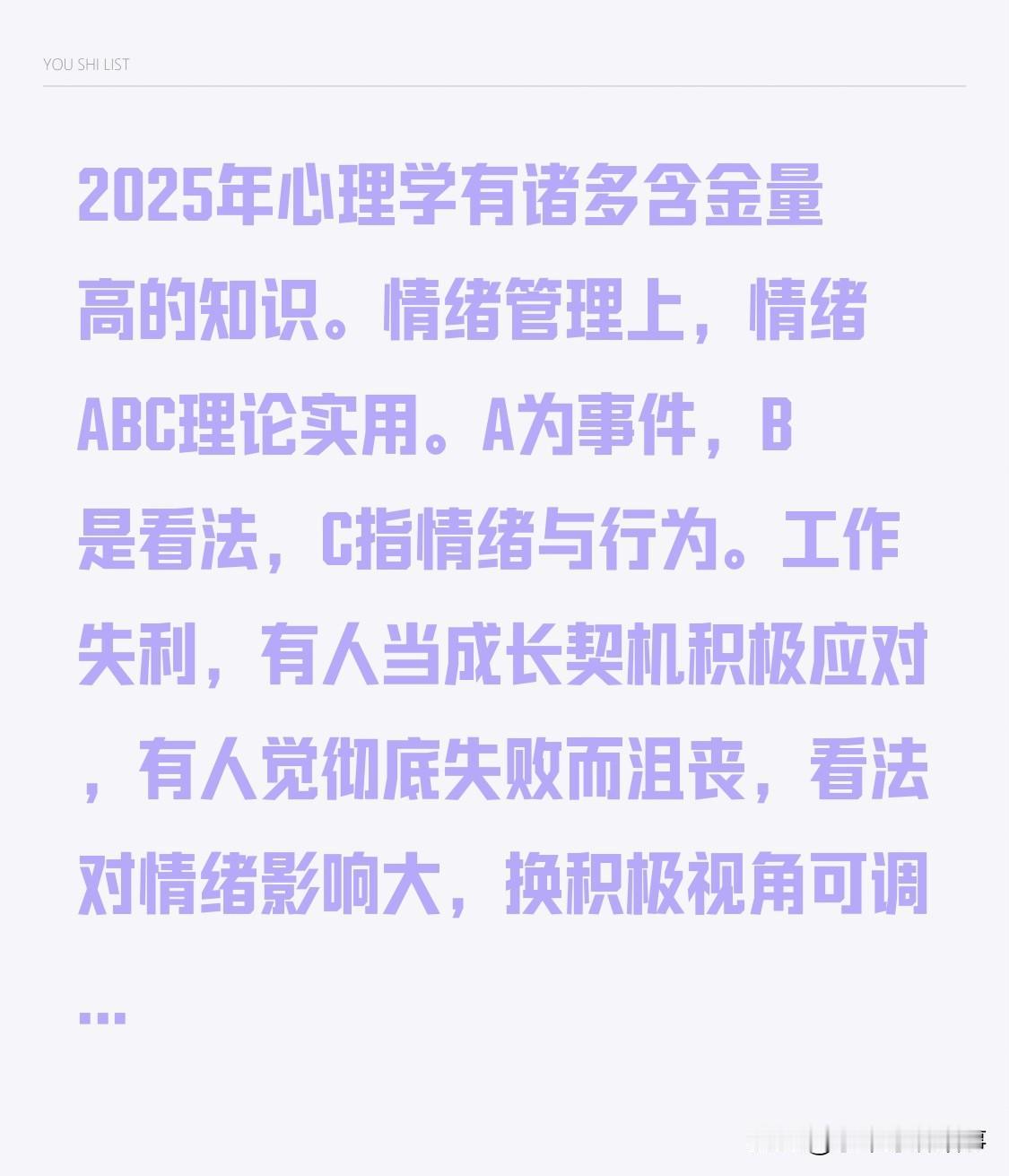 惊!2025年心理学藏着不少高含金量知识。情绪管理上,情绪ABC理论超实用。A是事件,B为看法,C指情绪与行为。工作失利,有人视其为成长契机积极应对,有人觉全盘皆输而沮丧,看法对情绪影响极大,换积极视角能调整情绪。 人际关系里,共情与边界意识缺一不可。共情增进信任,朋友倾诉时认真倾听、表达理解;边界意识保护自己,不打探隐私,学会拒不合理要求。 自我成长中,成长型思维和自我肯定很关键。相信能力可通过努力提升,遇困难积极尝试;每天花几分钟自我肯定,增强自信与认同感。掌握这些,生活更舒心!