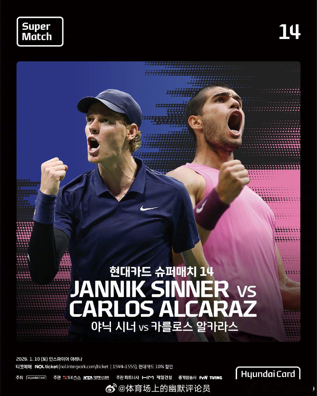 很高兴能够参与 Hyundai Card Super Match 14 这样一个特别的网球之夜。1 月 10 日,仁川 Inspire Arena,期待与大家一起感受网球的魅力与激情。门票相关信息可在大麦和携程上查看,希望能在赛场与大家相见!()
