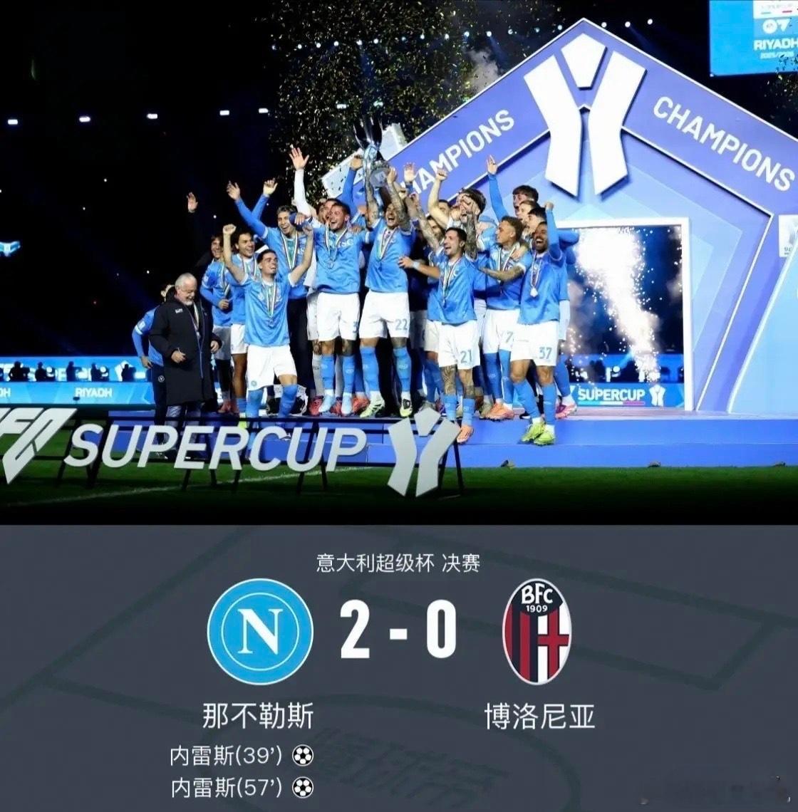 那不勒斯2:0博洛尼亚这场应该是三场意大利超级杯里质量最差的一场比赛了,那不勒斯的球员还没出汗,博洛尼亚自己就投降了。足球博洛尼亚vs那不勒斯意大利超级杯