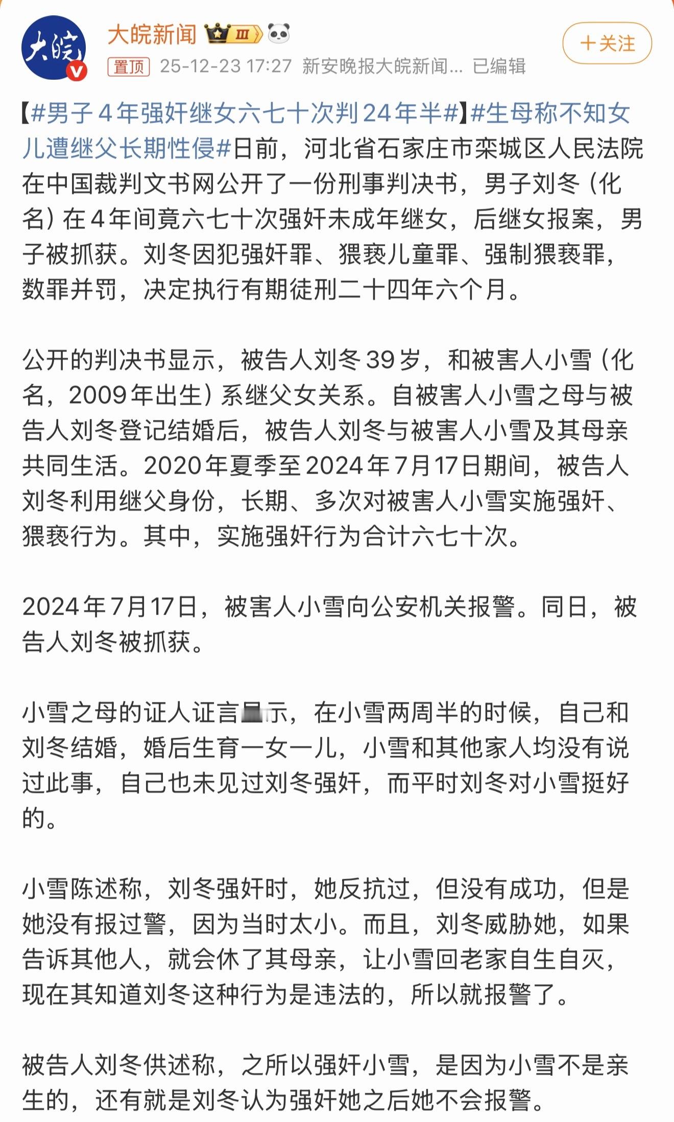男子4年强奸继女六七十次判24年半畜生啊,作为母亲难道发现不了孩子的异常吗?