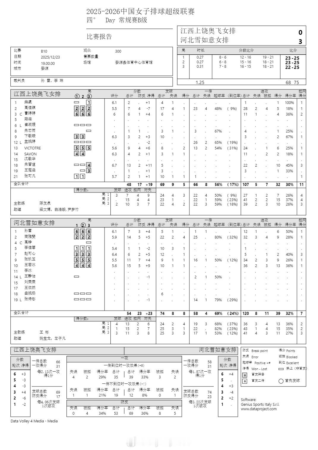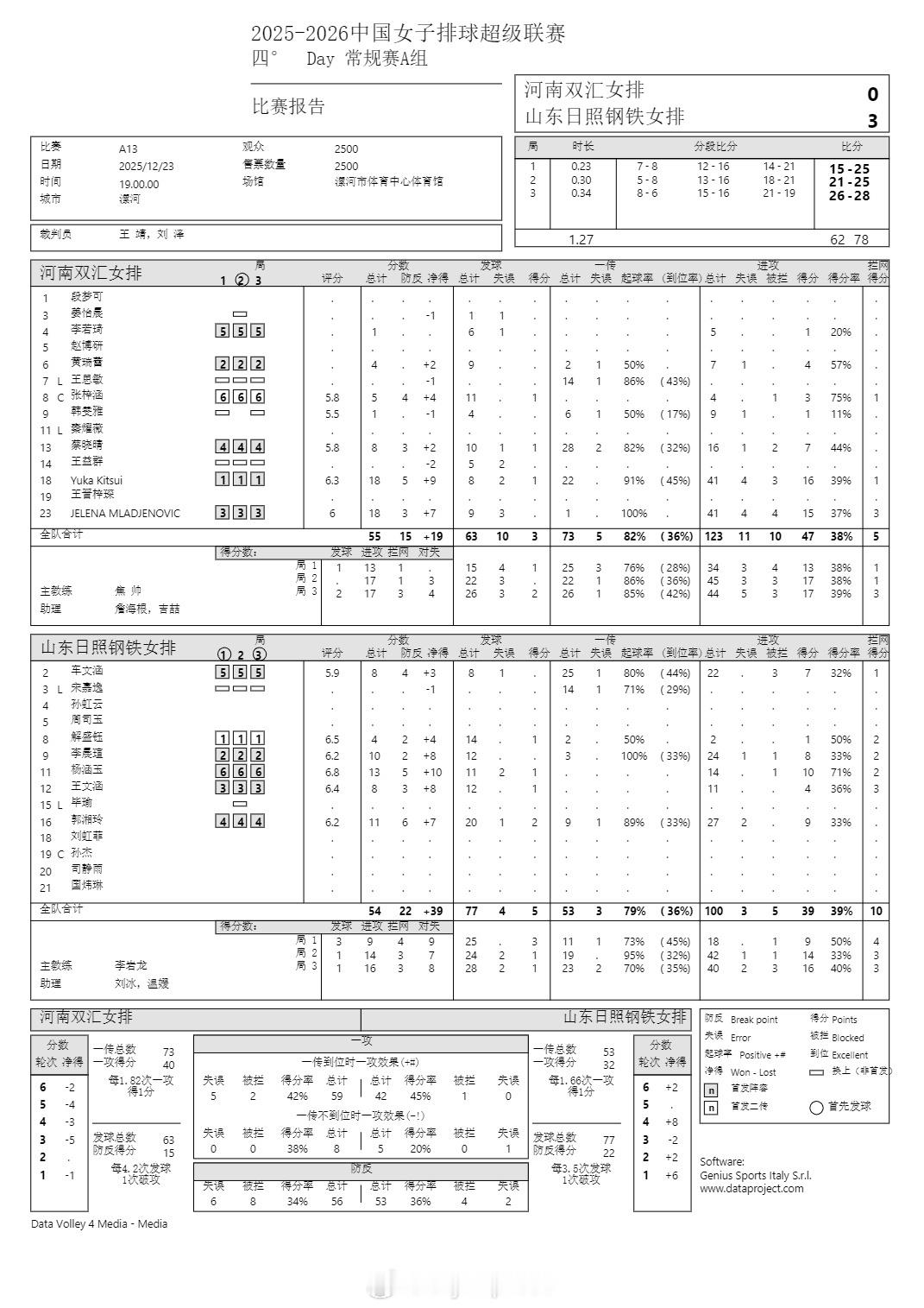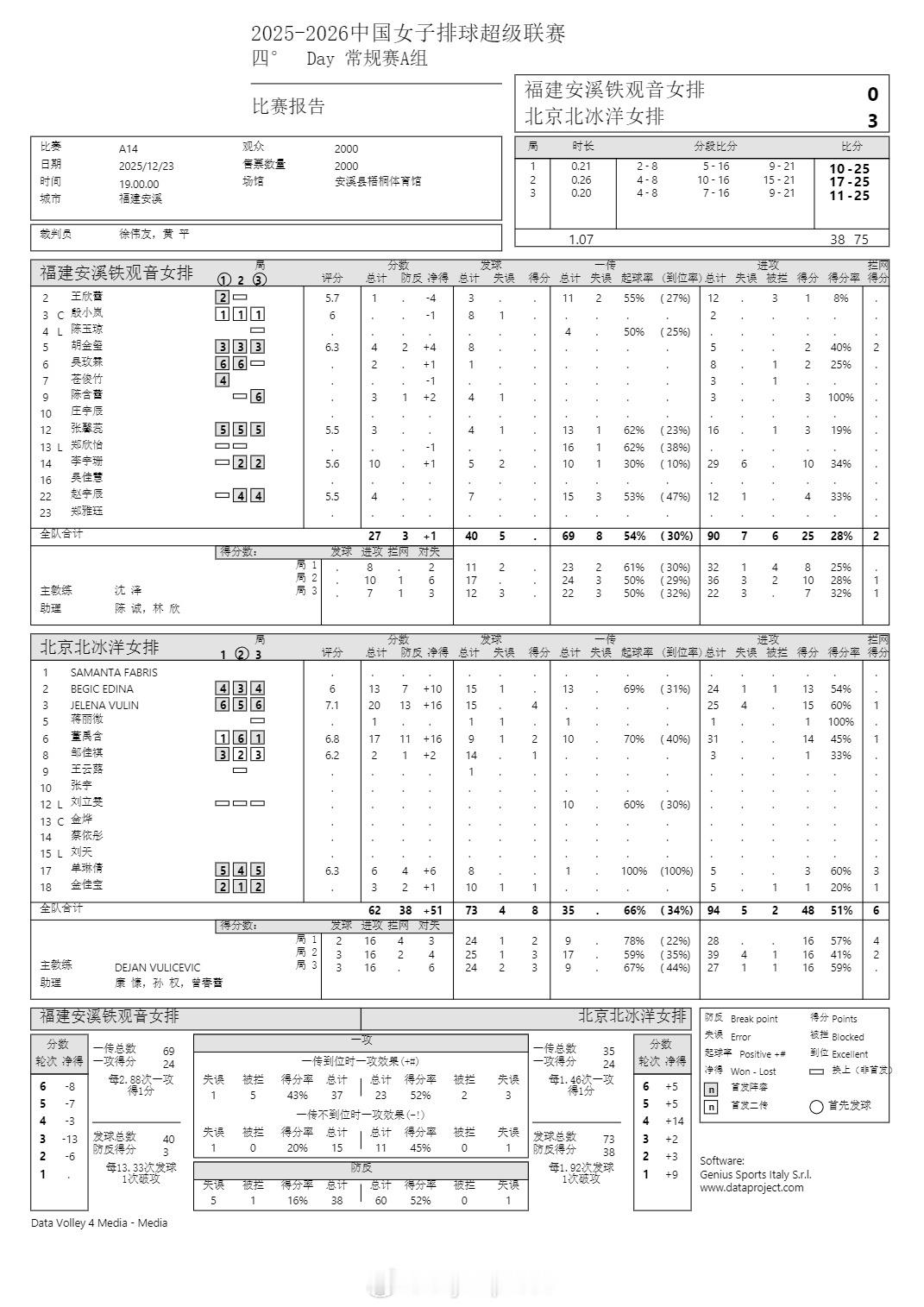 排超联赛 12月23日,女排联赛四场比赛技术统计。