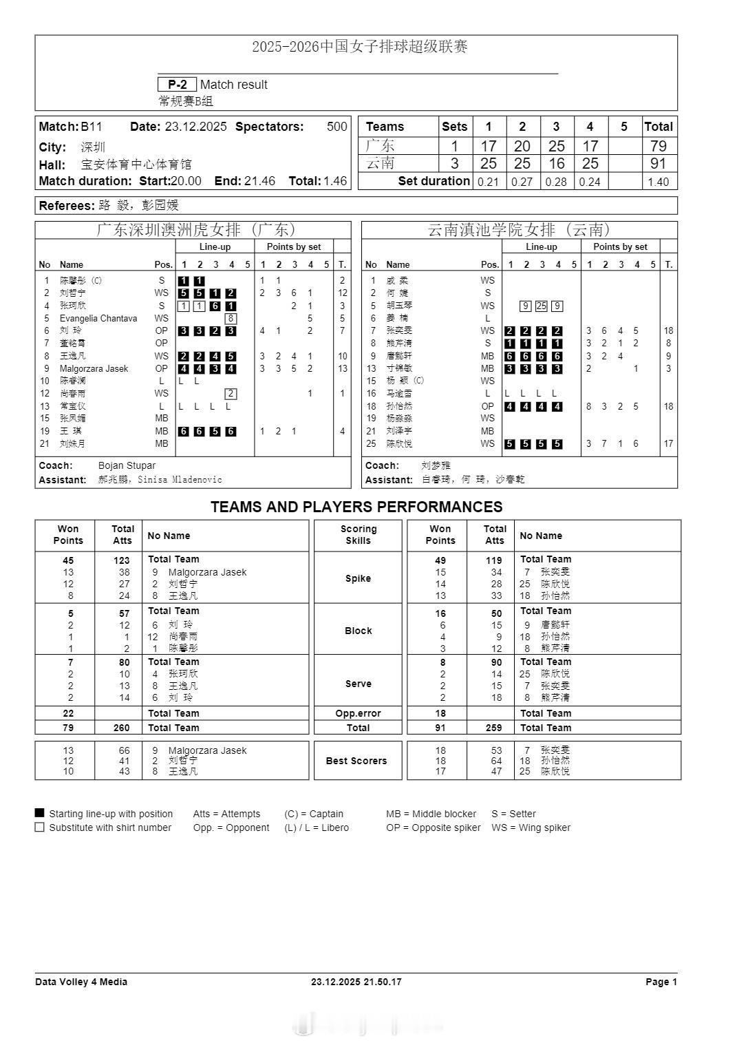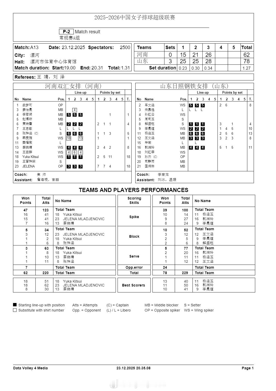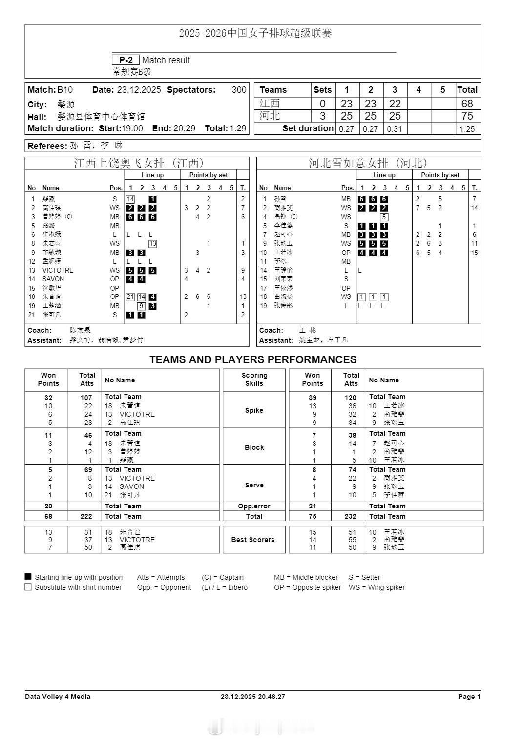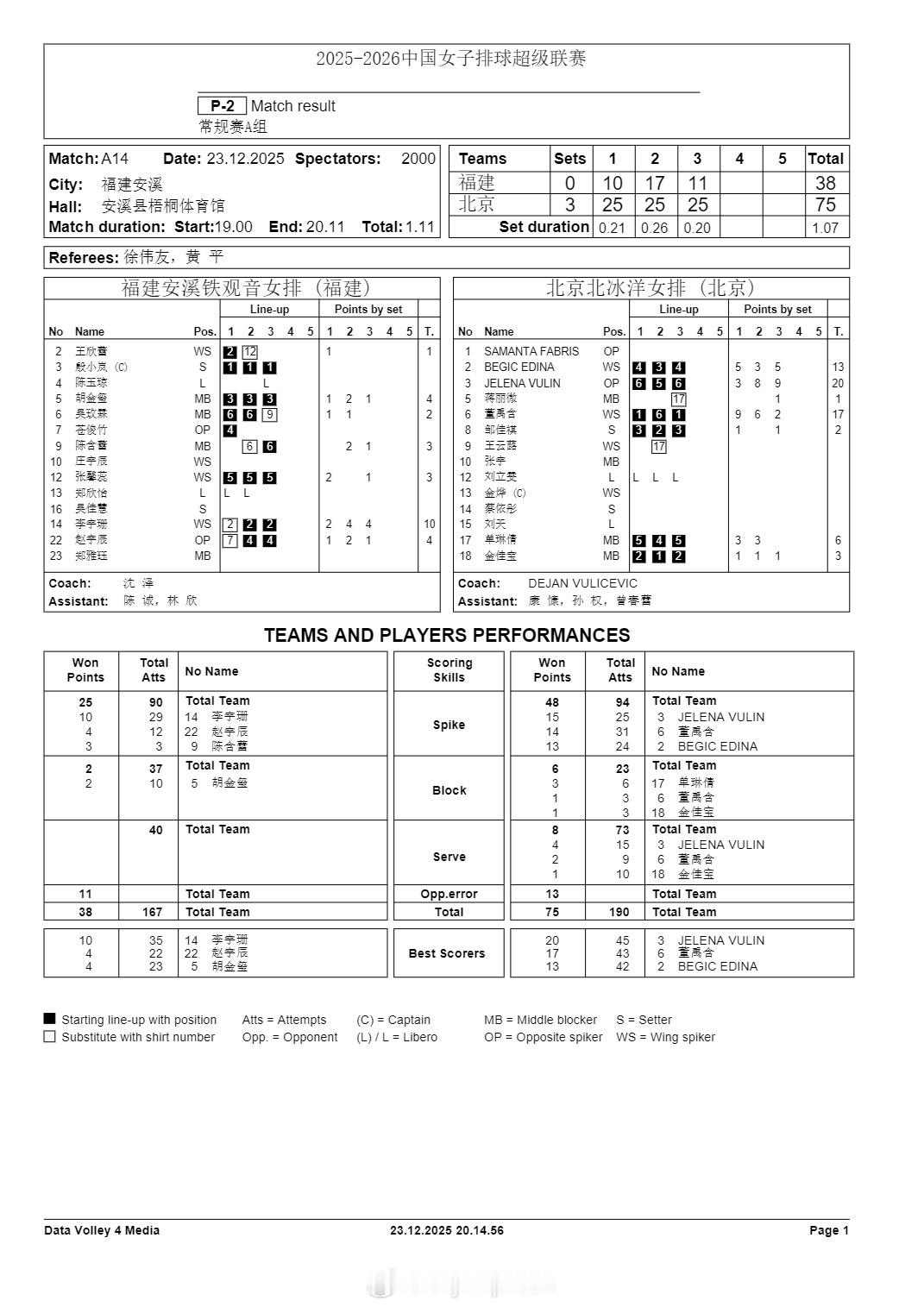 排超联赛 12月23日,女排联赛四场比赛技术统计。