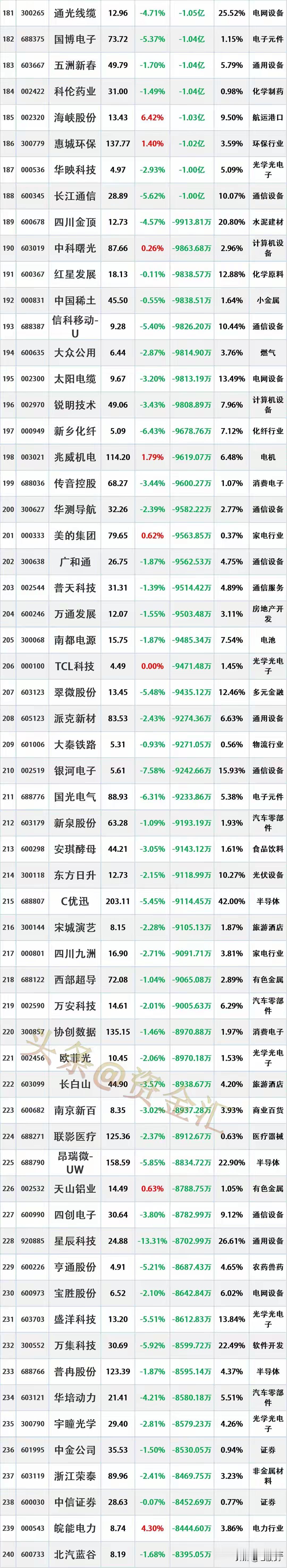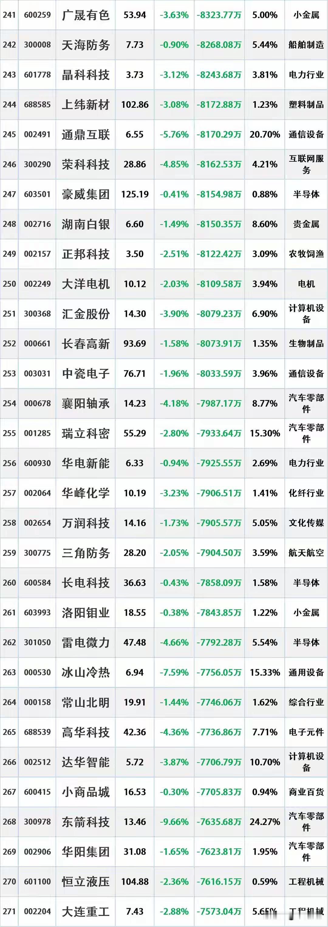 尾盘资金出逃,12月23日主力资金大幅流出的股票名单。 资金流出是指在一定时期内(如一天、一周等),主动卖出某只股票的资金量大于主动买入该股票的资金量。主动卖出是指投资者以买方的报价直接成交,显示出投资者对该股票的消极持有或抛售意愿。