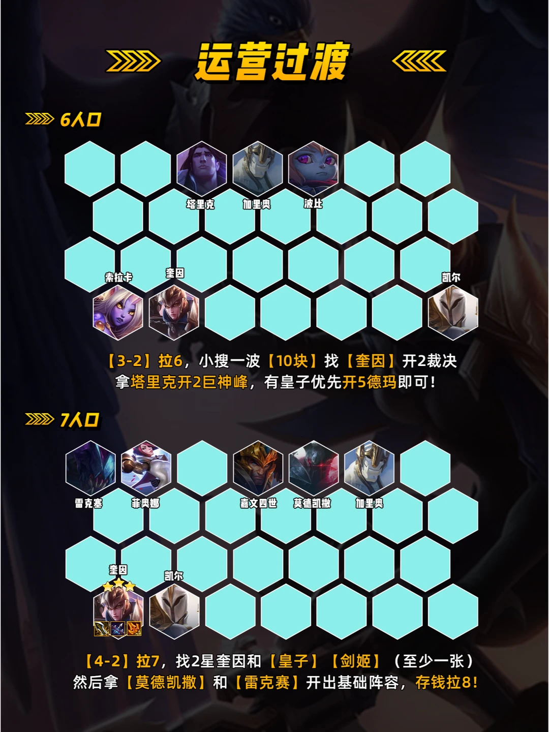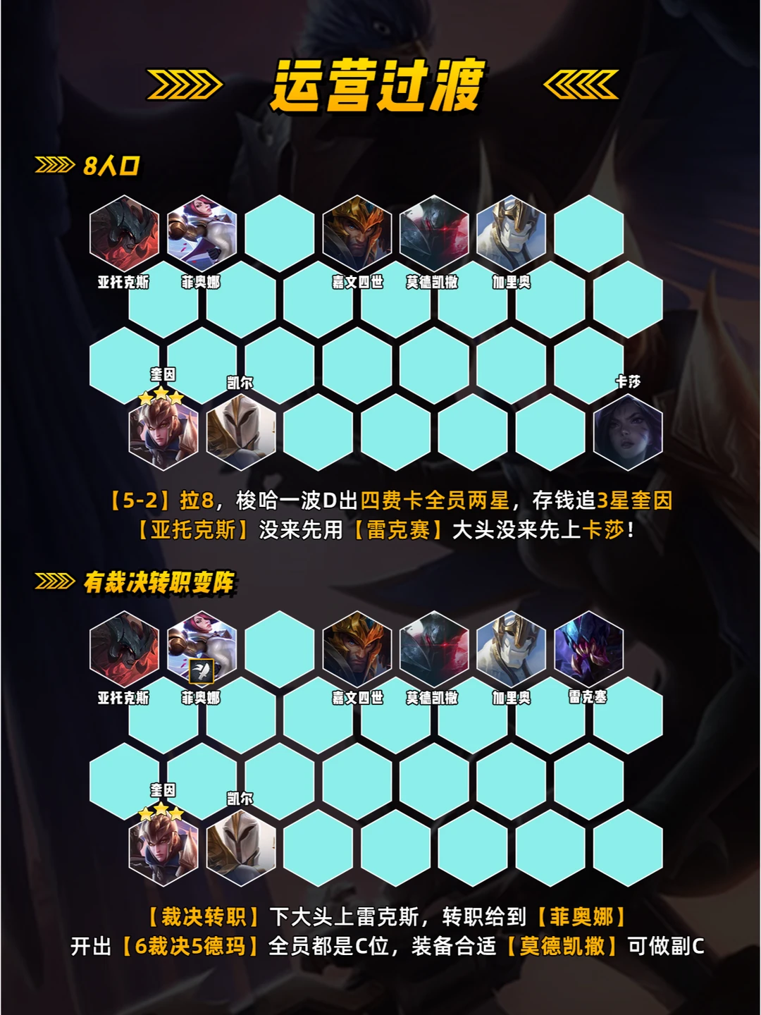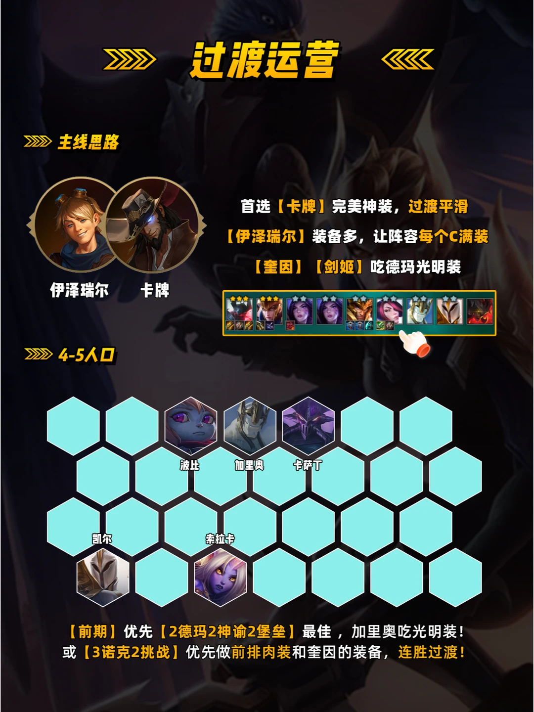 【英雄之力选择】 首选[卡牌大师] 因为阵容多个C位,前期[铁男][剑姬]来的早都可优先做完美装备,[奥 恩][伊泽瑞尔] 需要运营强! 【裁决转职变阵】 1.拿到[裁决转]优先开6裁决,对阵容提升特别大!硬玩这套像[艾欧尼亚书库] 城邦或[海克斯] 优先选择裁决转!