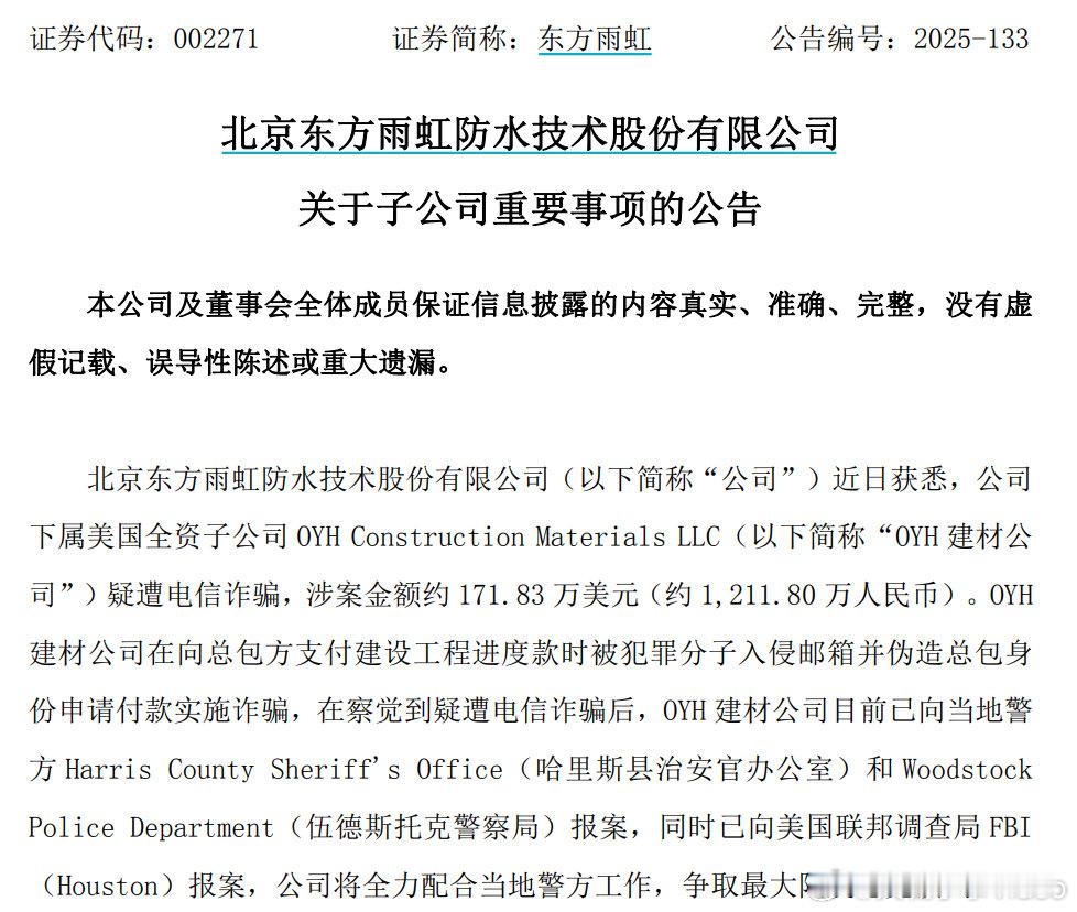 【东方雨虹遭诈骗向FBI报案】A股公司在美遭电信诈骗 12月23日晚间,A股公司东方雨虹发公告,内容显示,其美国全资子公司OYH建材公司疑遭电信诈骗,涉案金额约171.83万美元(约合人民币1211.80万元)。公告称,OYH建材公司在向总包方支付建设工程进度款时被犯罪分子入侵邮箱并伪造总包身份申请付款实施诈骗,在察觉到疑遭电信诈骗后,OYH 建材公司目前已向当地警方Harris County Sheriff's Office(哈里斯县治安官办公室)和WoodstockPolice Department(伍德斯托克警察局)报案,同时已向美国联邦调查局FBI(Houston)报案,公司将全力配合当地警方工作,争取最大限度避免损失。东方雨虹称,本次事件为偶发独立事件,不会对公司正常生产经营造成重大不利影响。同时,针对该事项,公司已成立专项工作组前往下属公司进行事件核查、善后处置及风险管控工作。由于案件正在侦办中,案件进展及最终结果存在不确定性,相关影响将根据案件侦办结果及会计准则要求进行相应会计处理。公开资料显示,有“防水茅”之称的东方雨虹成立于1995年,为数以万计的重大基础设施建设、工业建筑和民用、商用建筑提供高品质的系统解决方案,已成为优质的建筑建材系统服务商。2008年公司上市,2023年营业收入突破328.23亿元,2008至2023年业绩增长46倍。(中国基金报)
