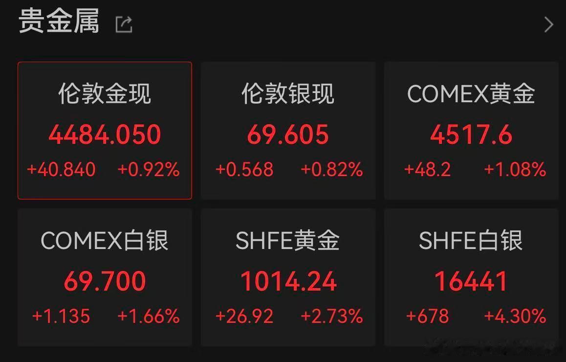 【黄金今年50次创新高】黄金白银彻底涨疯了 12月23日,黄金、白银等贵金属价格再度全线暴涨,多个品种刷新历史纪录,市场资金情绪被彻底点燃。盘中,现货黄金最高触及4497美元/盎司,距离4500美元/盎司大关仅一步之遥;COMEX黄金期货则率先突破4500美元/盎司大关。今年以来,金价已50次改写历史新高。国内市场同样火热。上期所沪金期货盘中最高触及1018元/克,再度站上“千元关口”;金饰方面,今日有多家品牌足金饰品报价首次站上每克1400元上方。其中,周大福、周生生报1403元/克,老庙黄金报1402元/克。与此同时,沪银期货主力合约突破16500元/千克,创历史新高;广期所铂、钯期货主力合约直线拉升,双双触及涨停板,成为盘面最亮眼的“明星品种”。今年以来,贵金属已成为全球资本市场中最具爆发力的资产之一。截至目前,黄金年内累计涨幅约65%,白银涨幅更是高达120%,显著跑赢黄金;铂、钯近期加速补涨,本月累计涨幅分别达到42%、46%。在期货市场持续狂飙的带动下,A股贵金属板块也掀起期股联动行情。23日,贵金属概念股再度走强,山东黄金大涨近7%,赤峰黄金、中金黄金等纷纷跟涨,板块整体人气高涨。值得注意的是,贵金属狂飙的同时,上海黄金交易所、上期所纷纷出手降温、警示风险,多家机构也提示追高风险。(券商中国)
