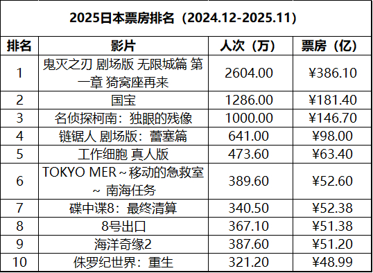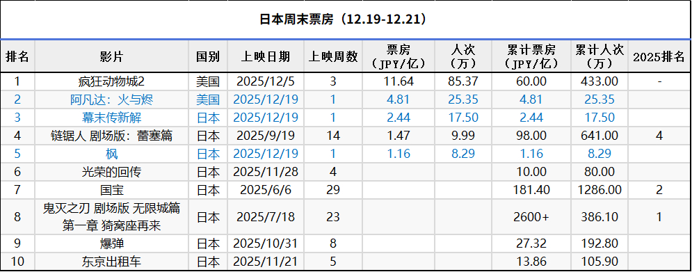 日本周末票房(12.19-12.21):1.《疯狂动物城2》三连冠,累计票房超60亿日元,成为今年外片票房冠军;2.《阿凡达3》开画成绩一般;3.《链锯人 剧场版:蕾塞篇》累计票房98亿排名日本影史第51,续作《链锯人:刺客篇》制作决定宣布。(数据:kogyotsushin、dorama)
