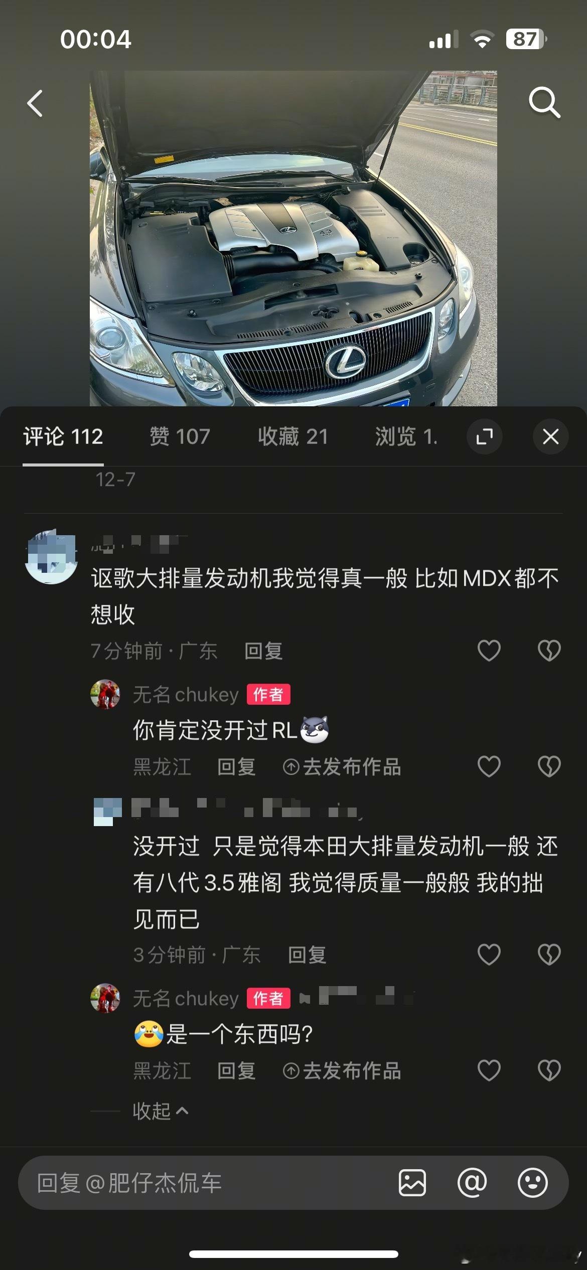 我觉得有些人真的很搞笑:比如今晚看到一个二手车贩子评论,说讴歌大排量发动机他觉得很一般,MDX他都不收。那MDX跟RL是一个车是一款发动机吗真的挺搞笑的,我回了句你肯定没开过,他又拿他的雅阁3.5来举例,那又是一个东西吗说了这么久,合着没开过RL啊就很难理解为什么会这样,明明都没开过,就觉得不行。体验过,真觉得不行,可以说,但开都没开过,就一直“凭经验”说不行,这啥想法啊,真的很疑惑对了,我说过,讴歌RL是我开过唯一一款觉得有高级感的本田车MDX除了音响比RL好,其他真的靠边站吧,底盘,转向,机器运转质感跟RL真没法比,就是有高级感和没高级感的区别 哈尔滨