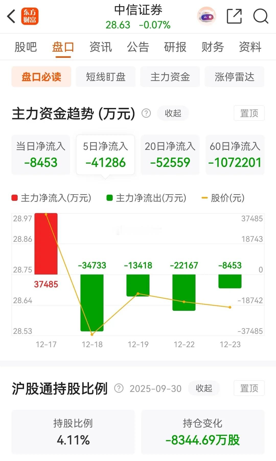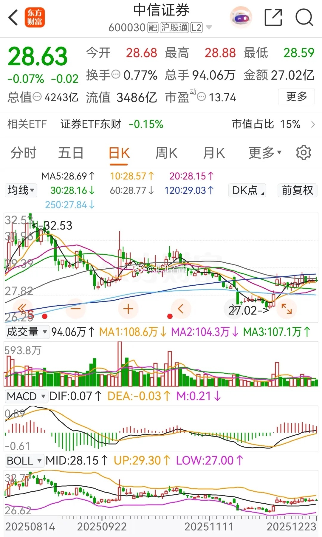 东方财富和中信证券今天冲高回落,小幅收跌,其中券茅东财跌了0.26%,券商一哥