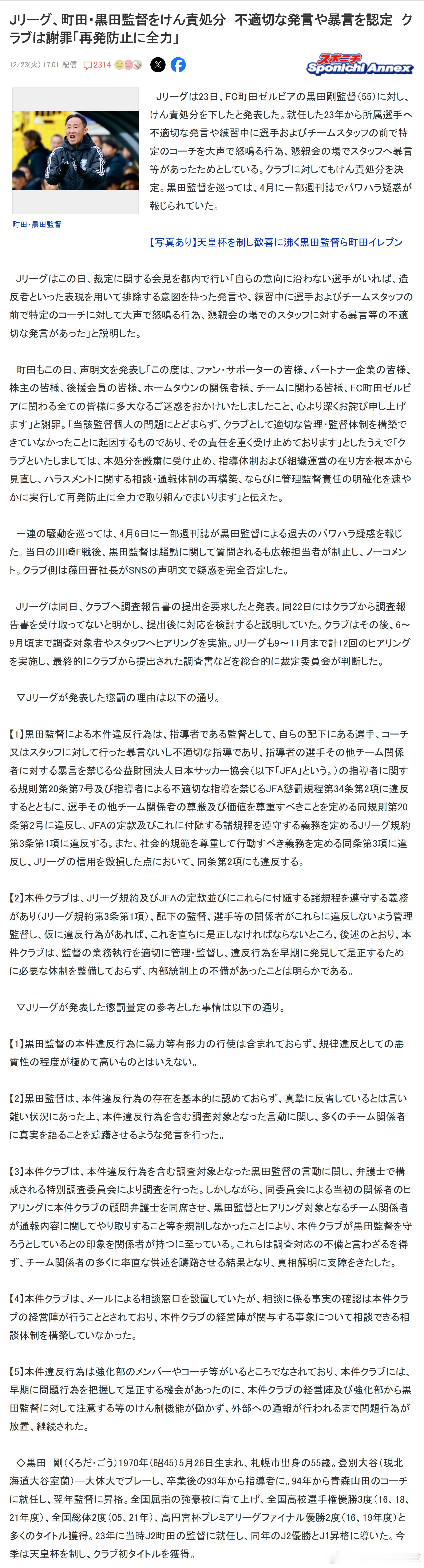 【J联赛对町田主教练黑田刚予以谴责处分 认定不当言论及粗暴言语 俱乐部致歉“全力防止再发”】J联赛于23日宣布,对FC町田泽尔维亚主帅黑田刚(55岁)予以谴责处分。原因是其自2023年上任以来,对所属球员发表不当言论、在训练中当着球员及球队工作人员的面大声呵斥特定教练、在联谊会上对工作人员吐露粗暴言语等。俱乐部方面也同时被处以谴责处分。围绕黑田主帅,4月曾有周刊杂志报道其涉嫌权力骚扰疑云。J联赛当日于都内召开相关裁定发布会,解释称“如果有不符合自身意图的球员,便使用‘造反者’等表述意图排除、在训练中当着球员及球队工作人员的面大声呵斥特定教练、在联谊会上对工作人员的粗暴言语等不当言论存在”。町田俱乐部当日也发布声明,致歉称“此次给各位球迷、支持者、合作伙伴企业、股东、后援会员、主场所在地的相关人士、球队相关各方、以及所有与FC町田泽尔维亚相关的人员造成了极大困扰,对此由衷深表歉意”。声明还指出“此事并非仅限于该主帅个人问题,而是俱乐部未能构建适当的管理监督体制所致,对此我们深感责任重大”,并表示“俱乐部将严肃接受本次处分,从根本上审视指导体制及组织运营方式,迅速重建骚扰相关咨询举报体制,并明确管理监督责任,全力防止再发”。围绕这一系列骚动,4月6日有周刊杂志报道了黑田主帅过去的权力骚扰疑云。当日川崎前锋战后,黑田主帅被问及骚动,但公关负责人制止,未予置评。俱乐部方面,藤田晋社长通过SNS发布声明,完全否认疑云。J联赛当日宣布,要求俱乐部提交调查报告书。同月22日,透露尚未收到俱乐部调查报告书,解释称收到后将考虑对应措施。俱乐部随后于6月至9月左右,对调查对象及工作人员实施访谈。J联赛也于9月至11月实施共计12次访谈,最终由裁定委员会综合俱乐部提交的调查书等进行判断。▽J联赛公布的惩戒理由如下。【1】黑田主教练的本案违规行为,作为指导者主帅,对麾下球员、教练或工作人员实施的粗暴言语或不当指导,违反公益财团法人日本足球协会(以下简称“JFA”)的指导者相关规则第20条第7号及禁止指导者不当指导的JFA惩戒规程第34条第2项,同时违反规定应尊重球员及其他球队相关人员尊严及价值的同规则第20条第2号,违反规定遵守JFA章程及附属诸规程义务的J联赛规约第3条第1项。此外,违反规定应尊重社会规范而行动的同条第3项,在损害J联赛信誉方面,也违反同条第2项。【2】本案俱乐部,有义务遵守J联赛规约及JFA章程并附属诸规程(J联赛规约第3条第1项),应管理监督麾下主帅、球员等相关人员不违反这些规程,若有违规行为,则须立即纠正,然而,如后所述,本案俱乐部未能适当管理监督主帅的业务执行,为及早发现违规行为并纠正而未能整備必要体制,内部统制存在明显缺陷。▽J联赛公布的惩戒量定参考事由如下。【1】黑田主教练的本案违规行为未包含暴力等有形力行使,作为纪律违规,其恶质程度并非极高。【2】黑田主教练基本否认本案违规行为的存在,难以称其真挚反省,此外,就包括本案违规行为在内的调查对象言行,向多名球队相关人员做出令其犹豫陈述真相的发言。【3】本案俱乐部,就包括本案违规行为在内的黑田主教练调查对象言行,由律师组成的特别调查委员会进行调查。然而,该委员会最初的相关人员访谈中,让本案俱乐部顾问律师同席,且未規制黑田主教练与访谈对象球队相关人员就举报内容进行交流等,由此导致相关人员产生本案俱乐部试图保护黑田主教练的印象。这些不得不说是调查对应缺陷,结果令多名球队相关人员犹豫率直供述,妨碍真相解明。【4】本案俱乐部虽设置了邮件咨询窗口,但咨询相关事实确认由本案俱乐部经营层进行,对涉及本案俱乐部经营层的事项,未构建可咨询的体制。【5】本案违规行为在强化部成员或教练等在场情况下发生,本案俱乐部虽有机会及早把握问题行为并纠正,但本案俱乐部经营层及强化部未对黑田主教练进行注意等制衡功能,未发挥作用,直至外部举报,问题行为被放置、持续。◇黑田 刚(Kuroda Go)1970年(昭和45年)5月26日出生,札幌市出身的55岁。从登别大谷(现北海道大谷室兰)到大阪体育大学踢球,毕业后93年起转任指导者。94年起担任青森山田教练,次年升任主帅。将球队培养成全国顶尖强队,全国高中锦标赛冠军3次(2016、2018、2021年度)、全国总决赛2次(2005、2021年)、高円宫杯超级联赛决赛冠军2次(2016、2019年度)等众多冠军。2023年上任当时J2町田主帅,率队获同年J2冠军并升入J1。本赛季天皇杯夺冠,获俱乐部首冠。