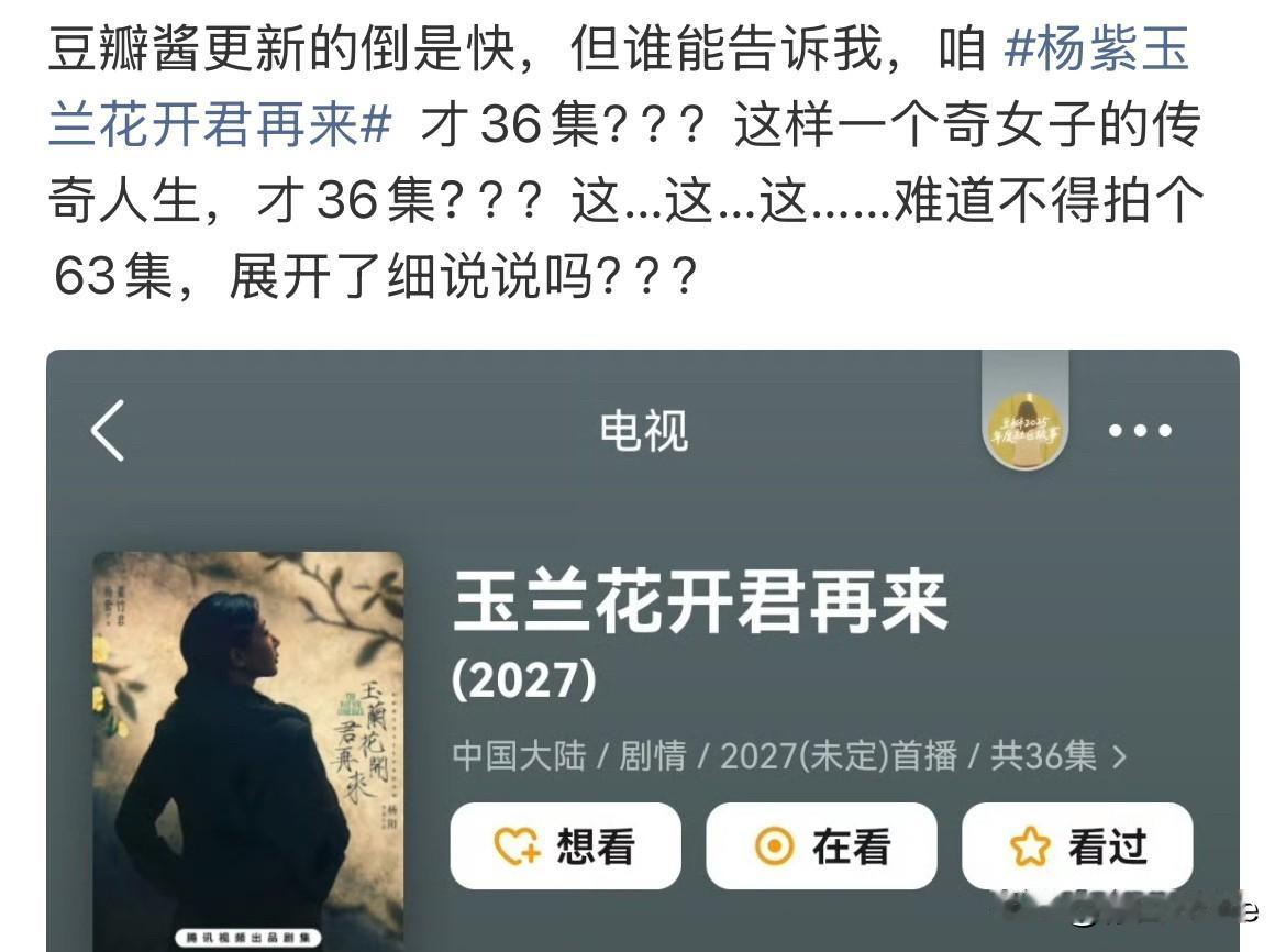 12月23日,杨紫,36集演绎97年人生! 第一次觉得36集是不是太短了?这部剧应该分上下两部吧!36集能演完董竹君一生么? 我之前是明确不支持剧分上下两部的,觉得看下部的时候会很割离,会丧失对这部剧的期待值,不如一口气放完! 现在了解完董竹君后,了解完杨紫想要演好董竹君的决心后,我反而期待这部剧分上下两部,最好能有80集,把董竹君的生平全部演绎出来,观众看透,演员演透! 《青簪行》当初都拍了60集!