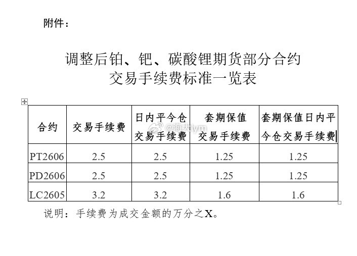 广州期货交易所:经研究决定,对铂、钯、碳酸锂期货相关合约的交易手续费标准、涨跌停板幅度和交易保证金标准作如下调整:自2025年12月25日交易时起,铂期货PT2606合约、钯期货PD2606合约的交易手续费标准调整为成交金额的万分之二点五,日内平今仓交易手续费标准调整为成交金额的万分之二点五;碳酸锂期货LC2605合约的交易手续费标准调整为成交金额的万分之三点二,日内平今仓交易手续费标准调整为成交金额的万分之三点二。自2025年12月25日结算时起,铂、钯期货合约涨跌停板幅度调整为10%,交易保证金标准调整为12%。如遇上述涨跌停板幅度、交易保证金标准与现行执行的涨跌停板幅度、交易保证金标准不同时,则按两者中幅度大、标准高的执行。近期影响市场运行的不确定性因素较多,相关品种价格波动较大。请各会员单位做好市场风险防范工作,切实加强投资者教育,提醒投资者理性合规参与交易,维护市场平稳运行。碳酸锂期货