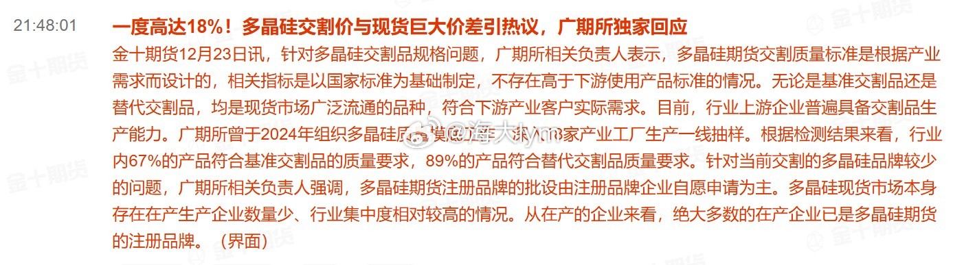 一度高达18%!多晶硅交割价与现货巨大价差引热议,广期所独家回应针对多晶硅交割品规格问题,广期所相关负责人表示,多晶硅期货交割质量标准是根据产业需求而设计的,相关指标是以国家标准为基础制定,不存在高于下游使用产品标准的情况。无论是基准交割品还是替代交割品,均是现货市场广泛流通的品种,符合下游产业客户实际需求。目前,行业上游企业普遍具备交割品生产能力。广期所曾于2024年组织多晶硅质量摸底工作,深入18家产业工厂生产一线抽样。根据检测结果来看,行业内67%的产品符合基准交割品的质量要求,89%的产品符合替代交割品质量要求。针对当前交割的多晶硅品牌较少的问题,广期所相关负责人强调,多晶硅期货注册品牌的批设由注册品牌企业自愿申请为主。多晶硅现货市场本身存在在产生产企业数量少、行业集中度相对较高的情况。从在产的企业来看,绝大多数的在产企业已是多晶硅期货的注册品牌。(界面)多晶硅期货