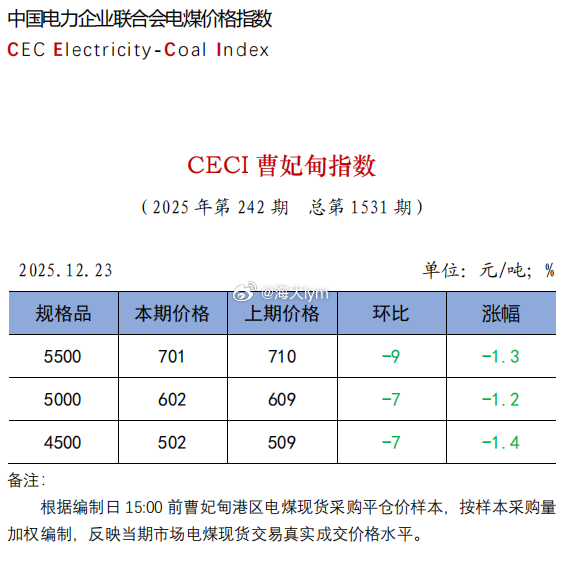港口5500大卡动力煤价格跌至700关口,11月中旬以来下跌129元/吨(15.5%的跌幅,830跌至701)(引用中电联 曹妃甸港口5500大卡动力煤报价)截止到12月23日,今年动力煤最高价830元/吨(11月13日-11月19日维持在这个价格);今年动力煤最低价616元/吨(5月30日-6月18日维持在这个价格);12月23日价格701元/吨CECI曹妃甸指数第1531期动力煤价格