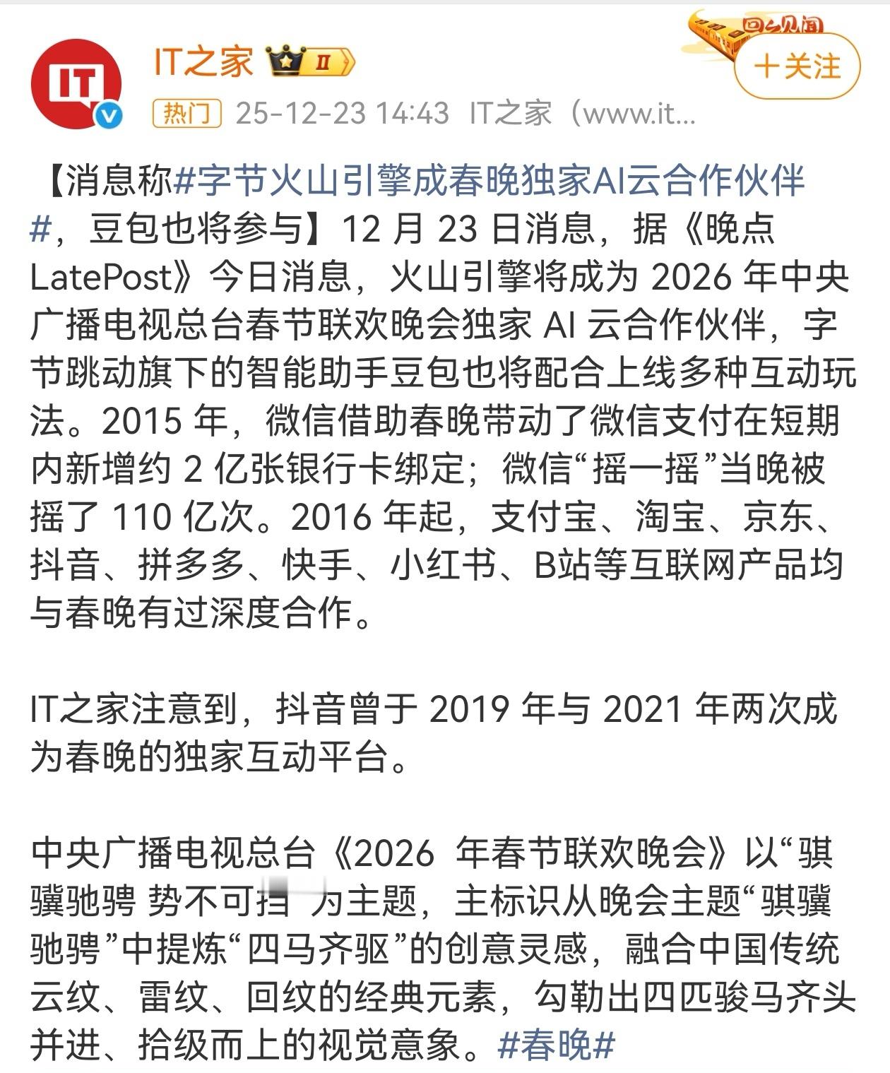 据悉,字节跳动旗下云服务平台火山引擎已确认成为2026年央视春晚的独家AI云合作