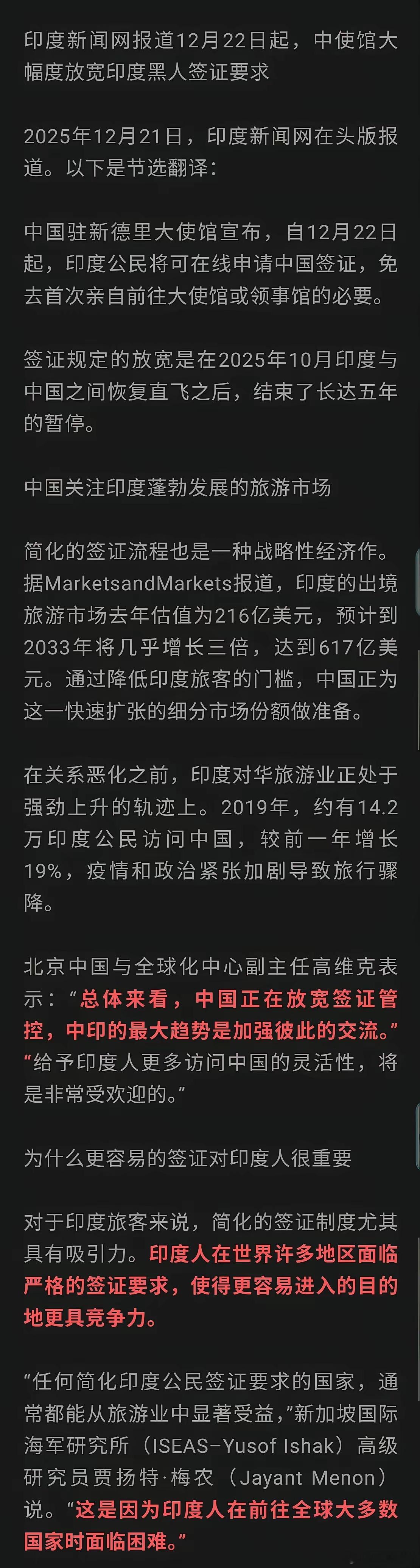 件比较恐怖的事情就要发生,庆幸的是还在可控范围。12月22日,印度媒体报道中国已经放松了对印度人的签证限制。确实有不少印度人来华可以促进旅游消费,但是一定要警惕的是黑户,因为印度人是一种奇葩的存在。一旦有一个印度人来了中国,他就会把全家都接过来,没有合法手续就黑在那里。这才是需要警惕的存在,前段时间在网上爆火的正宗北京印度美食,被爆出印度老板是黑户,已经被遣返回国了。希望可以严防死守,不要让蛀虫来扰乱我们的正常生活。