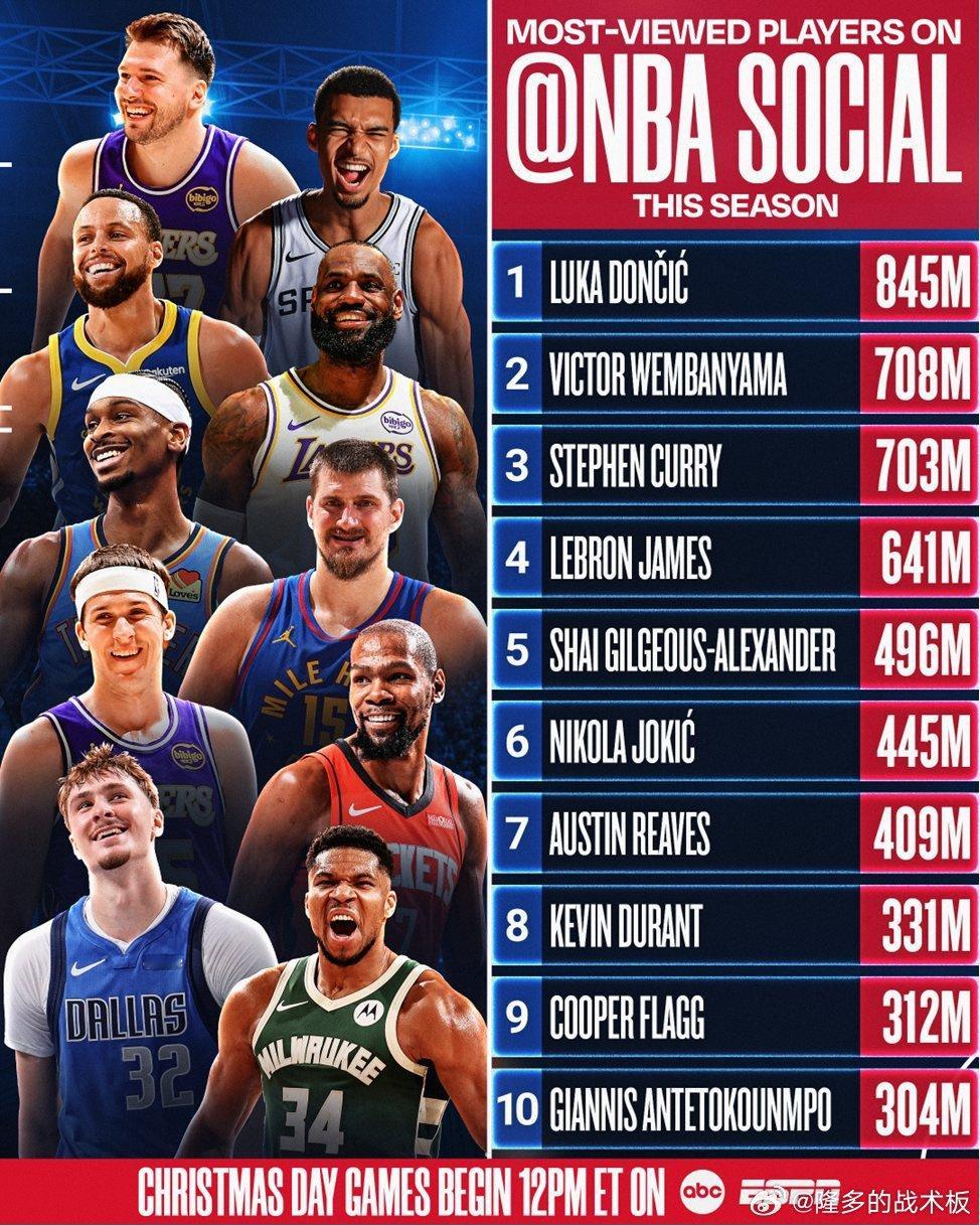 本赛季至今,东契奇、文班亚马和库里位列NBA社交媒体最受关注球员榜单前三名詹姆斯