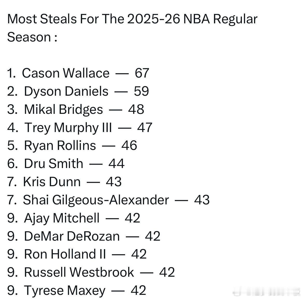 本赛季抢断排行🔒,雷霆三人上榜:1.卡森-华莱士67次2.戴森-丹尼尔斯59次3.米卡尔-布里奇斯48次4.墨菲47次5.罗林斯46次6.德鲁-史密斯44次7.邓恩43次8.亚历山大43次9.阿杰伊-米切尔42次10.德罗赞42次11.霍兰德42次12.威斯布鲁克42次13.马克西42次 新赛季篮不住