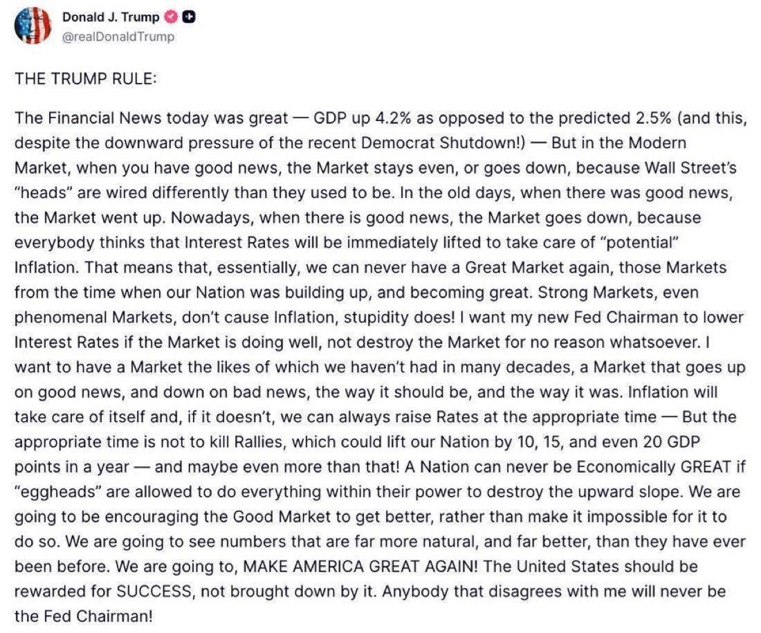特朗普称任何与他意见相左的人“永远”不可能成为美联储主席。