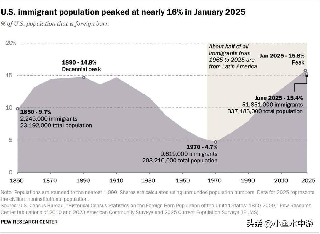 过去半个世纪,美国移民人口几乎只增不减,但 2025 年出现了明确反转,年初移民人口,还站在 5,330 万人的历史高点,占总人口接近 16%,但短短半年就少了一百多万人,这是因为过去10个月,驱逐出境变多、自愿离境增加、新移民进来得更少造成的。 (数据源自网络,仅供参考)