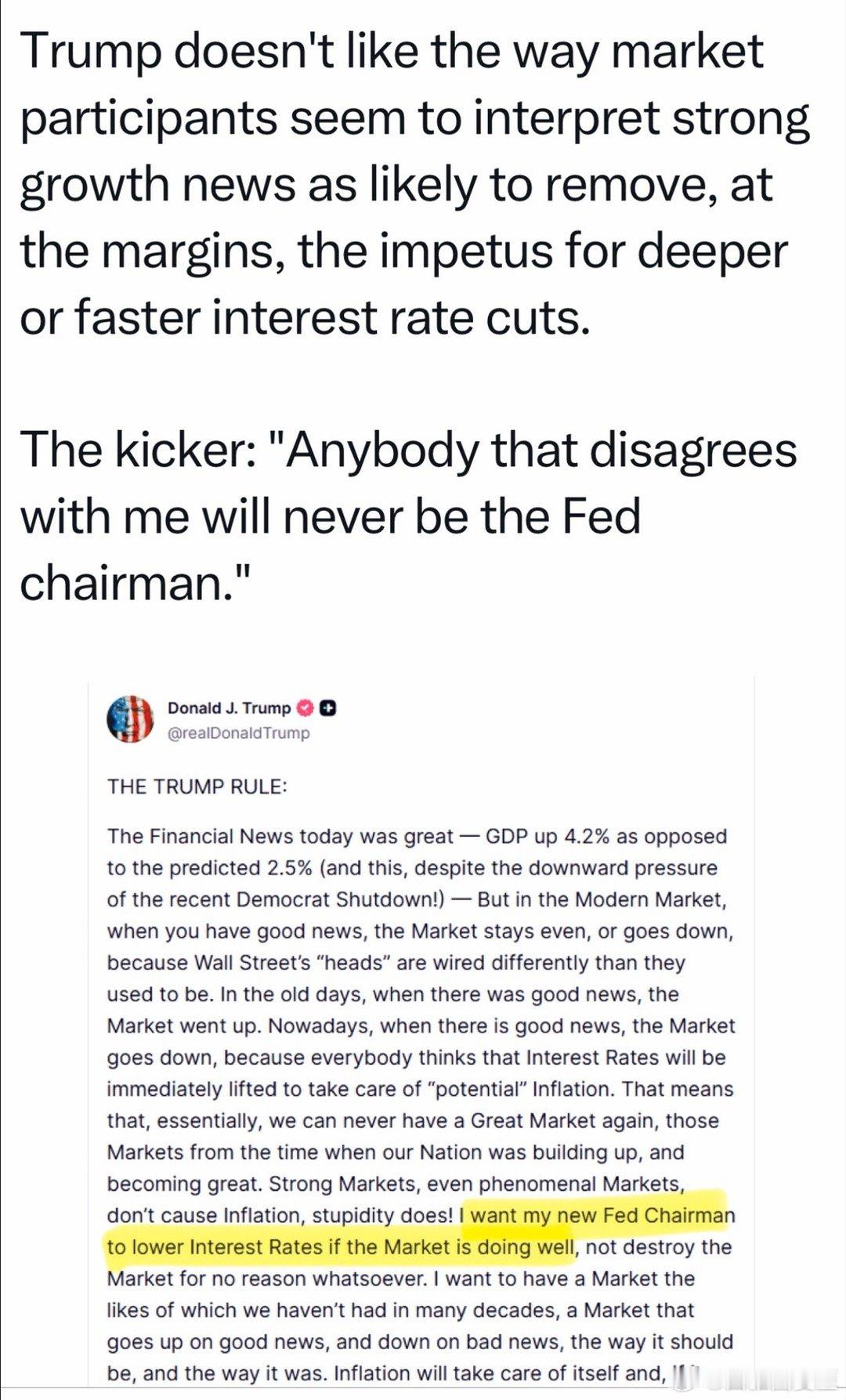 GDP数据超预期,降息预期随之降低美国总统:我想让我的新美联储主席,在市场好的时候也降息…不同意我的意见,就别想当美联储主席