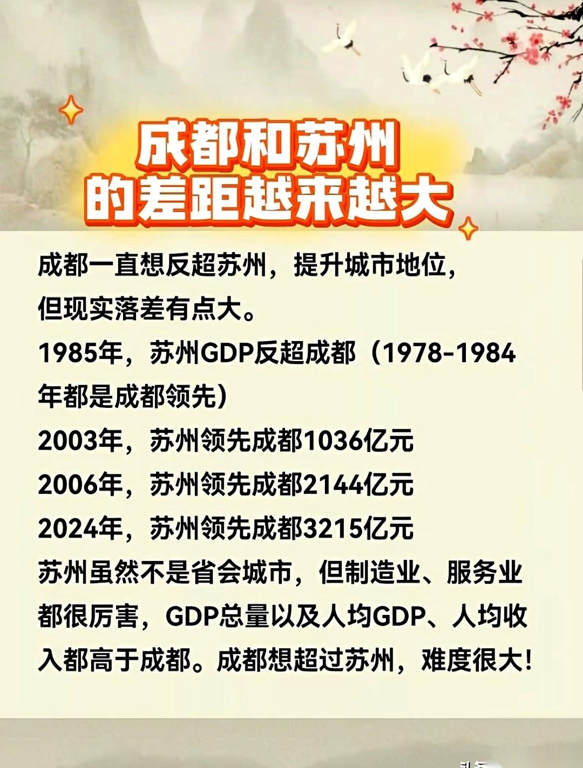 说实话,每次看到网上掰扯成都GDP总量超了杭州,一帮人跟着狂欢,我就觉得特有意思。 这感觉就像啥呢? 就像你家公司今年流水做了1个亿,隔壁老王家做了8000万。你到处跟人说“我比老王牛逼”。可人家不知道的是,你家一百口子人吃饭,老王家就十个人。人均一算,谁过得更舒坦,谁兜里更实在,一目了然。 成都这几年是火,火得一塌糊涂。 又是网红城市,又是年轻人扎堆,那股子安逸巴适的劲儿,谁不喜欢?表面上看,确实风光无限。 但火归火,面子归面子,里子呢? 你绕不开杭州啊。 人家是啥?人家是那种家里有矿、还有深厚底蕴的老钱。西湖、灵隐寺摆在那儿,文化底子厚得你够不着。更要命的是,人均赚得比你多,整个城市的效率和富裕程度,真不是一个量级的。 更别提旁边还蹲着一个苏州。 一个不声不响,闷声发大财的主儿。论经济实力,人家从来就没虚过谁。 所以啊,当网红挺好,有流量,有话题。 但想当“第五城”,光靠热闹和块头大是不够的。啥时候成都人均的钱包,也能跟杭州人一样鼓,那才叫真正的硬气。