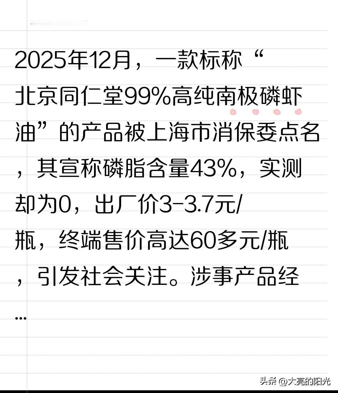 2025年12月,一款标称“北京同仁堂99%高纯南极磷虾油”的产品遭上海市消保委点名。该产品宣称磷脂含量达43%,实测却为零,出厂价仅3 - 3.7元/瓶,终端售价却高达60多元/瓶,此事引发社会广泛关注。涉事产品经销商是北京同仁堂(四川)健康药业有限公司,生产企业为安徽哈博药业有限公司。 此前南京博物院拍卖事件余波未平,如今又爆出北京同仁堂这一事件,两起事件让民众的社会信任感大幅降低。大家曾经无条件信赖的东西,背后竟被利益撕扯得千疮百孔。 人活一辈子,不过是一日三餐、一张床而已。有些人已然坐拥巨额财富,钱财多得花不完,却仍不知满足,想尽办法挖社会的墙角,为了一己私利,不惜牺牲民众的权益。