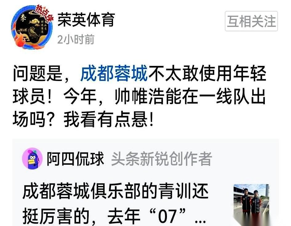 我跟你说,明年中超,成都队,记着一个名字:帅惟浩。 08年的小伙子。 亚洲这个年龄段,身价最高的那个。 这事儿想想就带劲。 咱们这儿,多久没出过这种让人眼前一亮、打心底里想看看他能飞多高的小孩儿了? 有人说太小了,中超那帮老油条,那身体对抗,撞一下不得散架? 嗨,我倒觉得,担心的有点多余。 足球这东西,有时候靠的真不是一身腱子肉。脑子,灵气,脚底下那一下,比什么都重要。小帅这孩子,看他踢球的视频,那股子机灵劲儿,是真稀罕。 再说了,成都队现在不就搞“青春风暴”嘛。去年艾比布拉不就进了一队?虽然因为点别的事儿没踢上,但路子已经给你趟出来了。说明啥?说明教练组敢用新人,愿意给机会。 这比什么都强。 你把一个天才苗子按在板凳上,按个几年,灵气都没了,那才叫暴殄天物。 让他上去冲,上去抢,哪怕是替补,哪怕一场就踢个十几二十分钟。让他见识见识真正的江湖是什么样,让他知道疼,知道累,知道怎么跟一群“老炮儿”斗智斗勇。 这才是成长。 真别怕他嫩。嫩,才有无限可能。 等着瞧吧,这孩子要是踢出来了,那可不只是成都队的骄傲。 是我们所有球迷的念想。