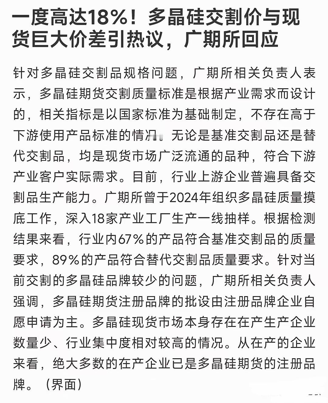 多晶硅期货交易出现巨大差价,完全颠覆了常识多晶硅期货到期交割的价格,比市场上直接买现货的价格高出18%(12月12日交割价59100元/吨,现货价50000元/吨)。这完全不符合常理,一般都是市场上多少价格期货就是多少价格,即使有偏差也不会太大,18%的差距就是有点离谱了。广期所回应:交割标准是按行业需求定的,不是故意提高。言外之意,就是多晶硅现在供不应求,才会导致多晶硅的价格上涨。但是有意思的是A股多晶硅龙头公司不涨反跌,显然是没有利好出现。