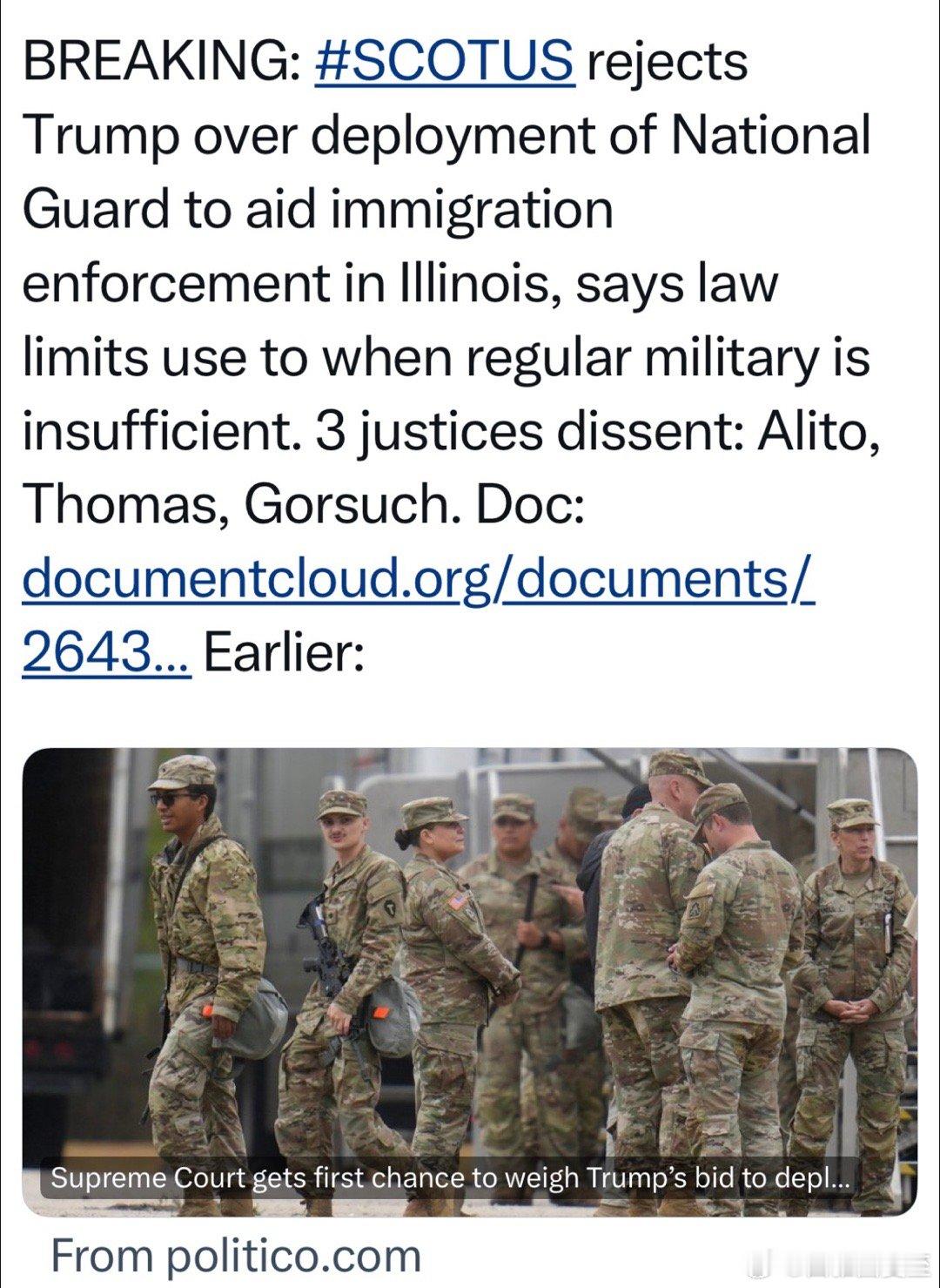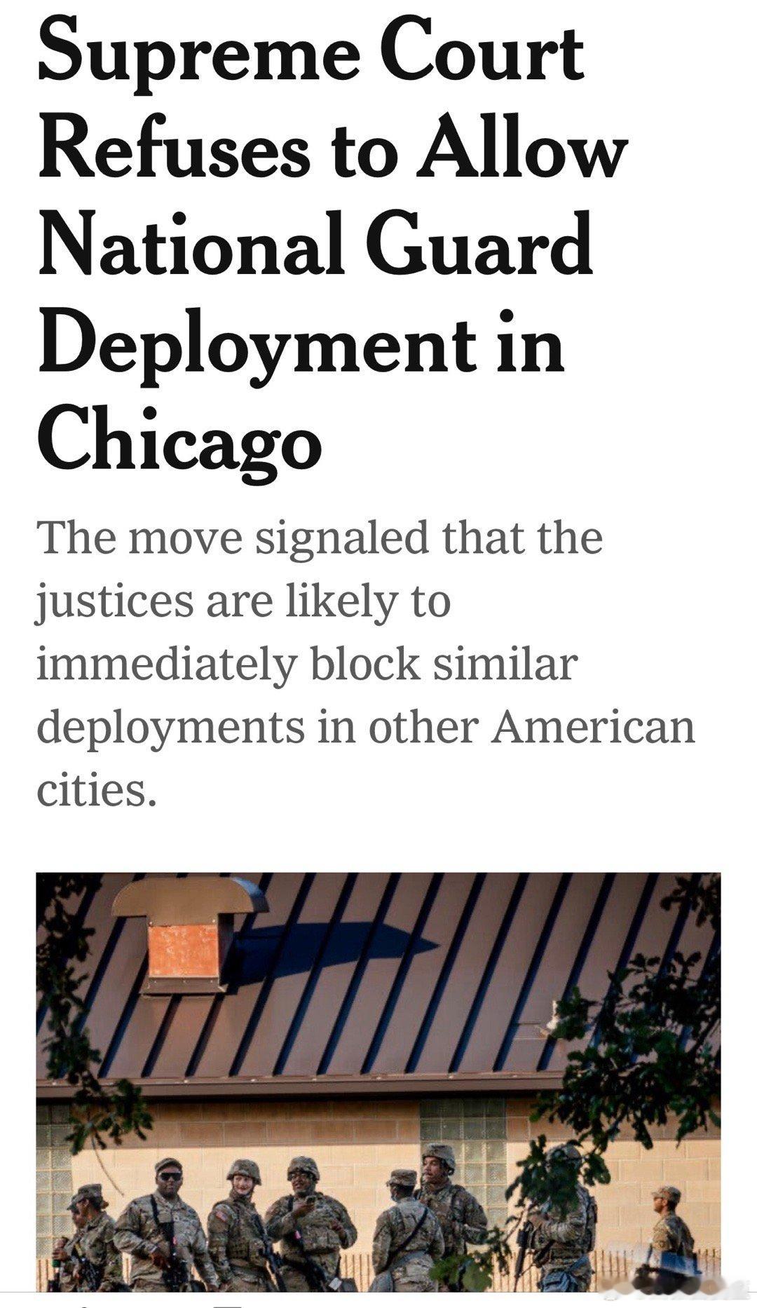 美国高法6-3判: 联邦不能派国民卫队到芝加哥“协助移民执法”,法律依据不足认为可以派的:Alito, Thomas, Gorsuch其他城市的类似案件,有了先例