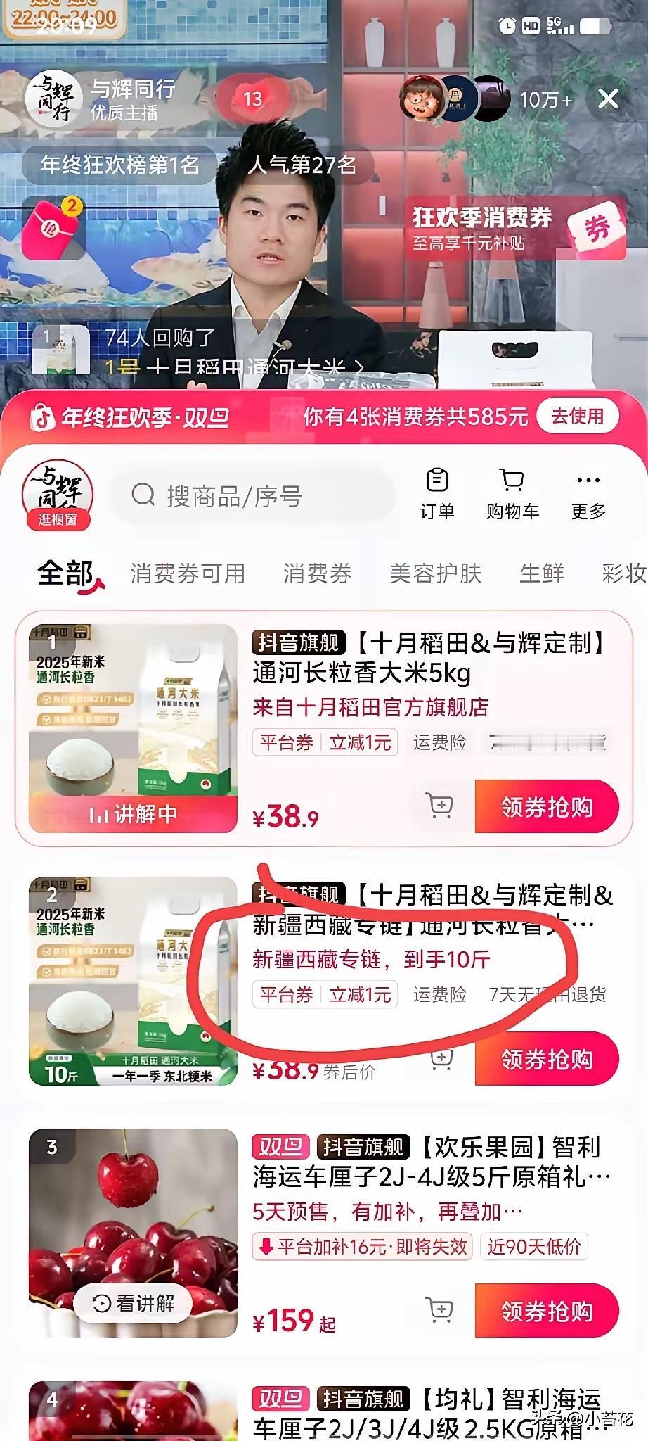 昨天的大米和海参你们都抢到了吗? 宇辉吸取了教训, 每次定制产品首发都因为单量少被你们嫌弃, 还有一些新疆西藏的朋友因为快递不抵达蛐蛐宇辉。 这次的大米和海参单量准备的足, 你们再抢不到就不要再为难宇辉。 35万人在线抢定制大米, 不到一个小时大米卖了四十多万单。 很多朋友一买就是好几单, 他们有的是囤货有的是买了做慈善送往养老院。 到了最后相关数据显示, 昨天晚上定制大米卖了52万单。 这个数据太出乎人意外, 因为盘锦大米专场爆单才不到两个月, 这定制大米又卖爆了, 这数据太让人难以置信了。 海参也卖了四五万单。 昨天的直播数据肯定是非常亮眼的, 与辉同行跑了1.81亿步, 交了新朋友11.4万。 本月健康数据累计30.15亿步, 全年累计224.794亿步, 看来今年的最后一个月又要刷新记录。 小兰兰上班八小时, 跑了1800万步, 交了新朋友1.5万。 12月累计跑了3.5亿步, 今年截止目前累计14.512亿步。 很多人都建议我不要公布健康数据, 因为太优秀, 怕遭人惦记。 树大招风的道理我懂, 但是定制产品上线, 怎么做那些人都会红眼。 与其遮遮掩掩, 不如大大方方展示出来让他们围观。 是福不是祸, 是祸躲不过。 定制产品挡了人家的道, 不管怎样他们都会费尽心思对定制产品围追堵截, 诋毁拉踩各种操作早就上线。 防不住那就只能守, 与辉同行自己把控好产品质量, 至于其余的事情, 消费者的投票才是最完美的答案。 散会! 董宇辉 与辉同行