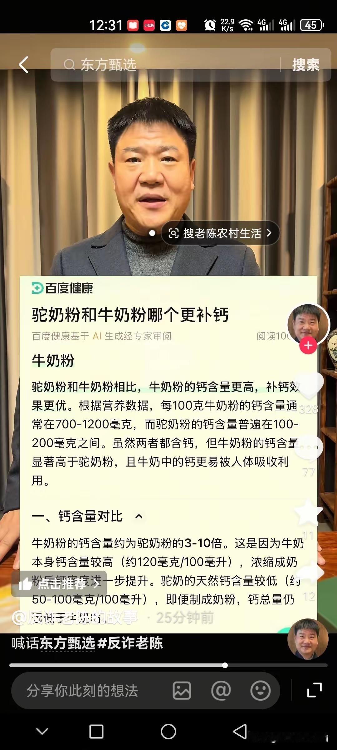 “反诈老陈”公开喊话某选, 直播间里卖驼奶粉涉嫌虚假宣传。 某选新疆外场的时候, 主播在直播带货时声称, 一杯驼奶粉的含钙量是普通牛奶的十倍, 如果需要大量补充蛋白质和钙的, 驼奶粉是首选。 这款驼奶粉质量有问题吗? 肯定是没有的。 但是驼奶粉的蛋白质和钙含量比牛奶高十倍? 这也是没有的。 经过各种数据对比显示, 其实牛奶含钙量比驼奶含钙量更高。 根据营养数据, 每100克牛奶粉的钙含量通常在700-1200毫克, 而驼奶粉的钙含量普遍在100- 200毫克之间。 虽然两者都含钙, 但牛奶粉的钙含量显著高于驼奶粉, 且牛奶中的钙更易被人体吸收。 驼奶粉产量肯定比牛奶低, 价格也应该比牛奶粉高一些。 我个人认为, 两种奶粉有各自的特点。 你们卖驼奶夸驼奶是你们的推销手段, 无可厚非。 但是罔顾事实的夸大其词宣传, 还对牛奶粉的营养成分拉踩, 这就是不应该。 作为一个上市公司的主播, 卖货也应该实事求是讲解, 而不是为了销量虚假宣传。 哎,不知道这一次老板会不会出来再一次道歉? 我想大抵是不会的, 每次出现这样的问题, 他都擅长“避而不谈”。 配料表躲猫猫的事件被官媒点名批评, 到目前为止他都保持沉墨, 金口不开, 这就是老板的特点。 散会!