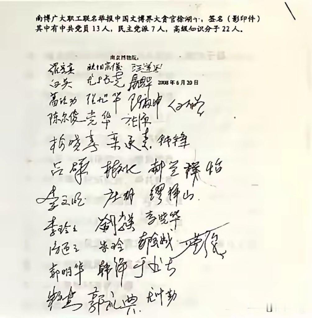 文博硕鼠!必须严惩! 这页泛黄的签名纸,是2006年南博职工联名举报的珍贵见证,13名中共党员、7名民主党派人士、22名高级知识分子的联合署名,42个手写签名墨迹渐褪,却钉死了17年前那场孤勇的举报——他们撕开的,是"守护者"变"盗窃者"的丑陋假面。 更让人愤怒的是背后的利益链条:前院长徐湖平身兼两职,把博物馆当"提款机",四步操作就将国宝洗白:先定调为"赝品",再调拨到自己主管的文物总店,低价转给儿子,最后拍卖出天价。 那幅盖着"虚斋至精之品"收藏印的《江南春》,6800元贱卖后身价飙至数千万,马未都直言:"就算是仿作,这个价格也透着对捐赠人的轻蔑"。 法律早有红线:《博物馆藏品管理办法》明确要求,处置文物需公示并征得捐赠人同意,但庞家后人三四十年间毫不知情。从承德李海涛500元贱卖一级文物,到陕西李宝平私藏12箱国宝,这些"内鬼"比盗墓贼更可恨——他们懂行、有权、知漏洞,用专业知识挖国家墙角。 这群联名举报的文博人,用"担当"二字告诉我们:文物保护的底线,从来不是靠法律条文硬撑,而是靠从业者的良知守护。 如今国家文物局已介入调查,我们要的不只是追责一个人,更要挖透利益链条、堵死制度漏洞,让"监守自盗"者付出惨痛代价!
