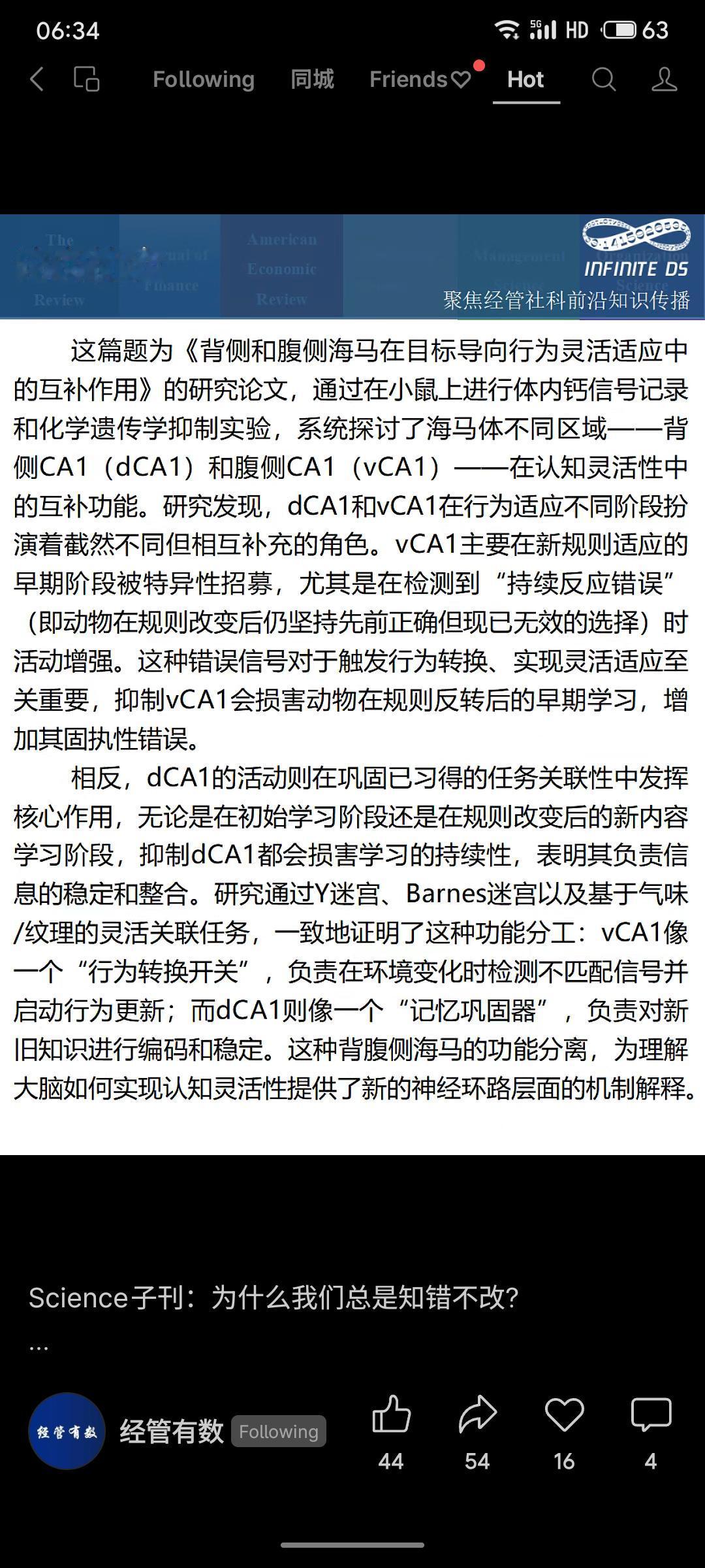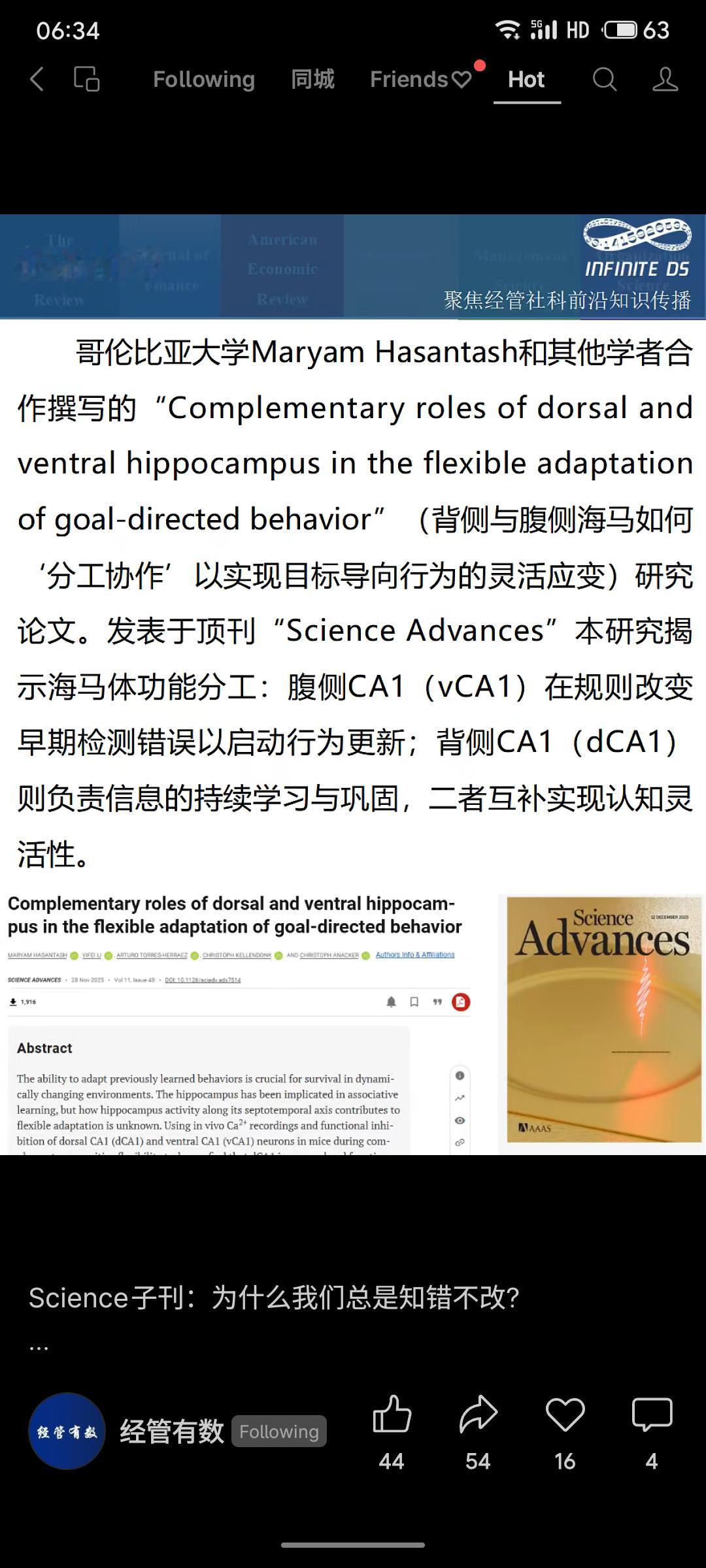 《科学》子刊研究揭示,海马体背侧(dCA1)与腹侧(vCA1)区域功能互补:vCA1在规则改变时充当“行为转换开关”,负责早期错误检测;dCA1则作为“记忆巩固器”,负责信息持续学习。二者协同工作,为“知错难改”等认知灵活性现象提供了神经机制解释。