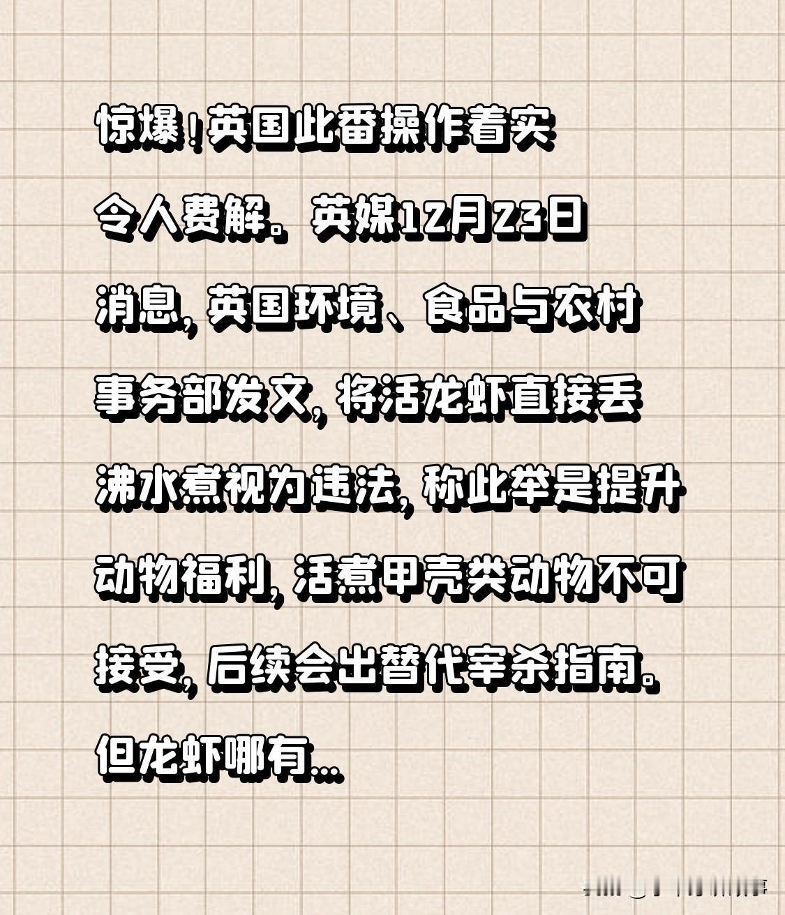惊爆!英国这波操作实在让人摸不着头脑。据英媒12月23日消息,英国环境、食品与农村事务部发文,将直接把活龙虾丢进沸水煮定为违法,称是为提升动物福利,活煮甲壳类动物不可取,后续会出台替代宰杀指南。 可龙虾哪有猫狗那样的情感感知?这新规似在搞形式主义,与其纠结龙虾怎么煮,不如多解决民生、经济等更紧迫的社会问题。真不知是为动物着想,还是博眼球。