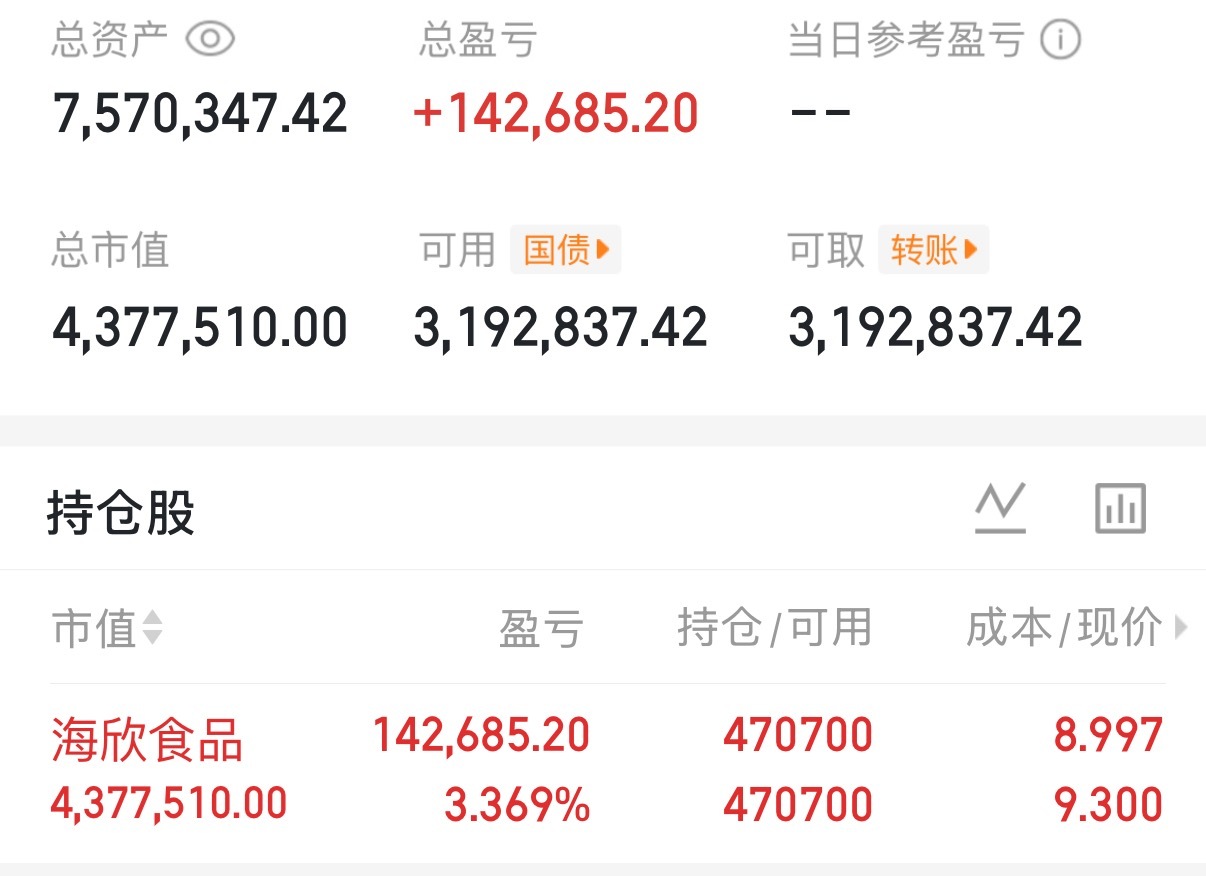 大家早上好呀,玲珑目前的持仓只有一个海欣食品,大家收到点赞评论666支持一下玲珑