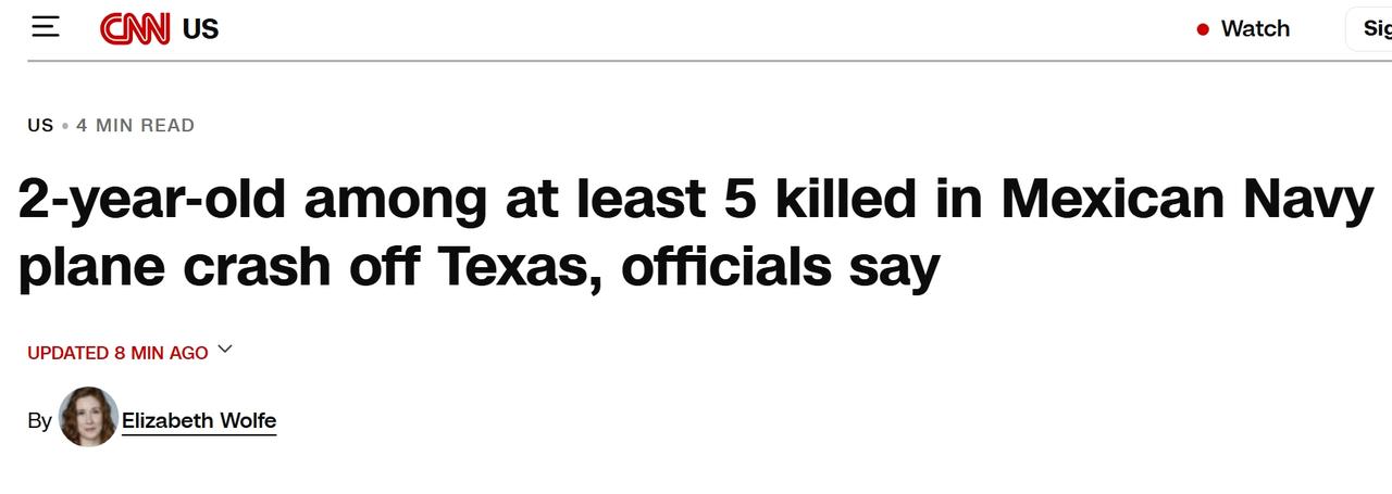 墨西哥海军飞机在美国水域坠毁,至少5人遇难 美国海岸警卫队官员表示,当地时间周一下午,一架载有医疗病人的墨西哥海军飞机坠入德克萨斯州加尔维斯顿湾水域,造成至少五人遇难,其中有两岁儿童。 墨西哥海军在一份声明中证实,飞机上共有八人——四名海军机组成员和四名平民,这架飞机当时正在运送烧伤患者。 海岸警卫队部门发言人告诉CNN,仍有一人下落不明,两人被救出并送往医院,但他们的具体状况尚不清楚。 墨西哥总统克劳迪娅·谢因鲍姆周二在新闻发布会上向机上乘客和水手的家属表示慰问。 谢因鲍姆说:“在黑匣子被回收和分析之前,无法确定坠机原因。” 该事件与今年早些时候的另一起飞机失事有惊人的相似之处,当时一架载有六名墨西哥公民的空中救护机——其中包括一名来美国接受紧急医疗治疗的儿童——在起飞后不久坠毁在费城的一个社区,无人生还。
