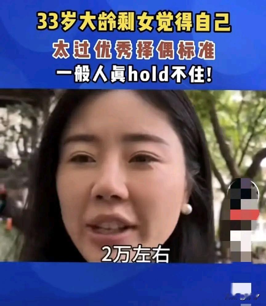 相亲角惊现33岁大龄优质女, 看着大爷大妈手中的相亲条件, 她不禁笑出了声, 觉得他们条件都很差, 他想找一个年龄不超过30的, 而且月薪2万左右, 并且还要长得帅一点阳光一点, 毕竟自己长得就很好看, 而且还非常的独立, 因为找不到门当户对的, 于是这才来到相亲角, 发现相亲角的男生条件都不行, 嘲笑别人找不到对象, 殊不知她才是那个小丑, 33岁了还想找30岁以内的男生, 自己月薪5000元, 还想找月薪2万左右的男生, 这不是异想天开这是什么? 怪不得这么多年找不到对象, 原来是没有一点自知之明, 以为自己打扮的美美的, 就会有白马王子找她, 像她这样的可能真的要剩下了! 大家对于这位女生的条件怎么看? 相亲交友 女生相亲条件 大龄姑娘相亲 大龄青年相亲难 大龄女子相亲 相亲女 女生相亲年龄 大龄相亲